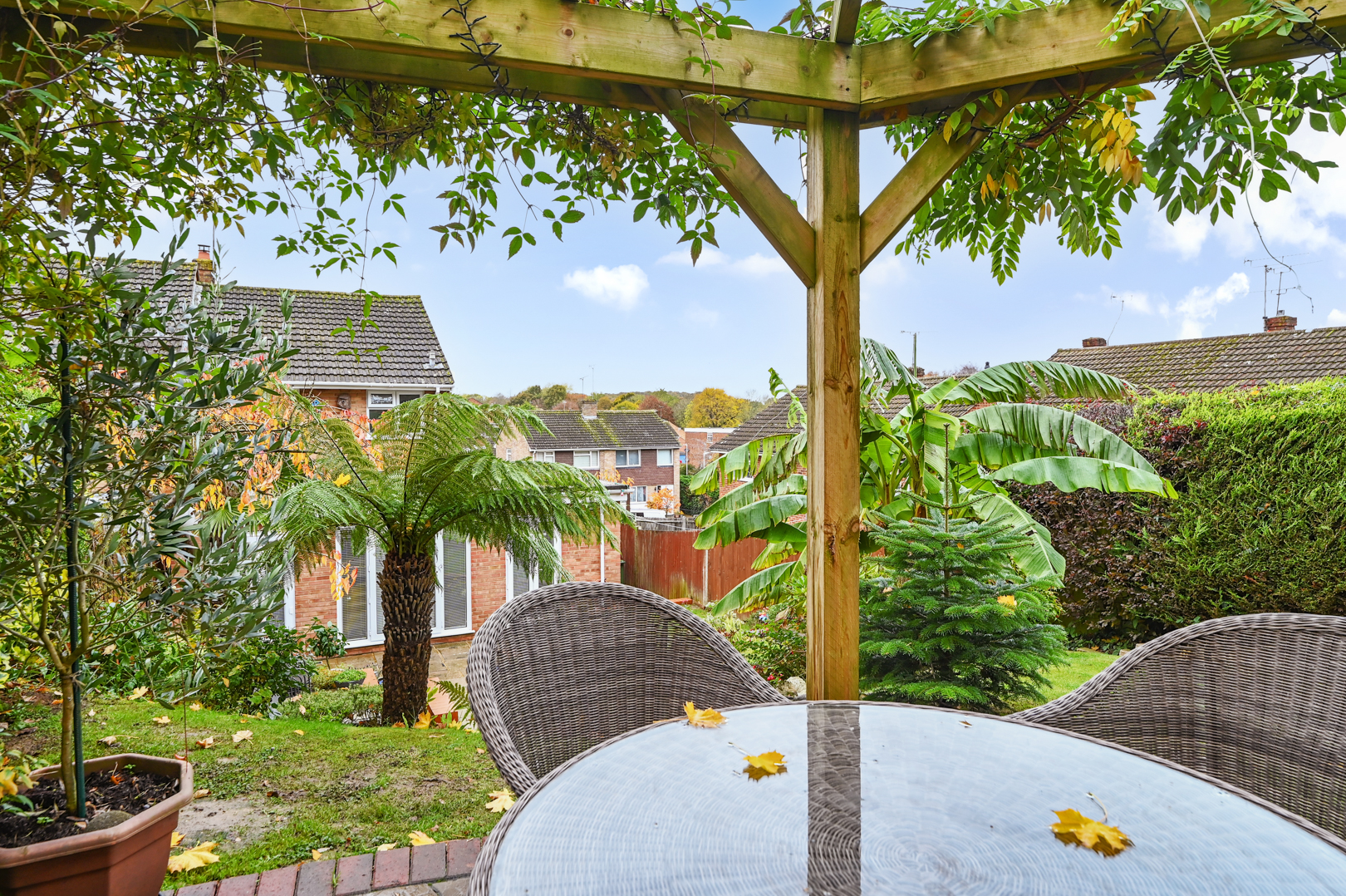 Lovingly maintained tiered garden with selection of lawned areas with matured borders. Patio area and steps up to further pergola covered patio gated side and rear access.