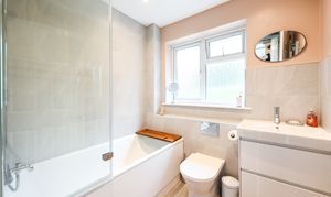 White suite comprising low level wc, wash hand basin with vanity storage under and mixer tap, panelled bath with mixer tap, mains fed shower and shower screen, obscured window to rear, locally tiled walls with inset spotlights.