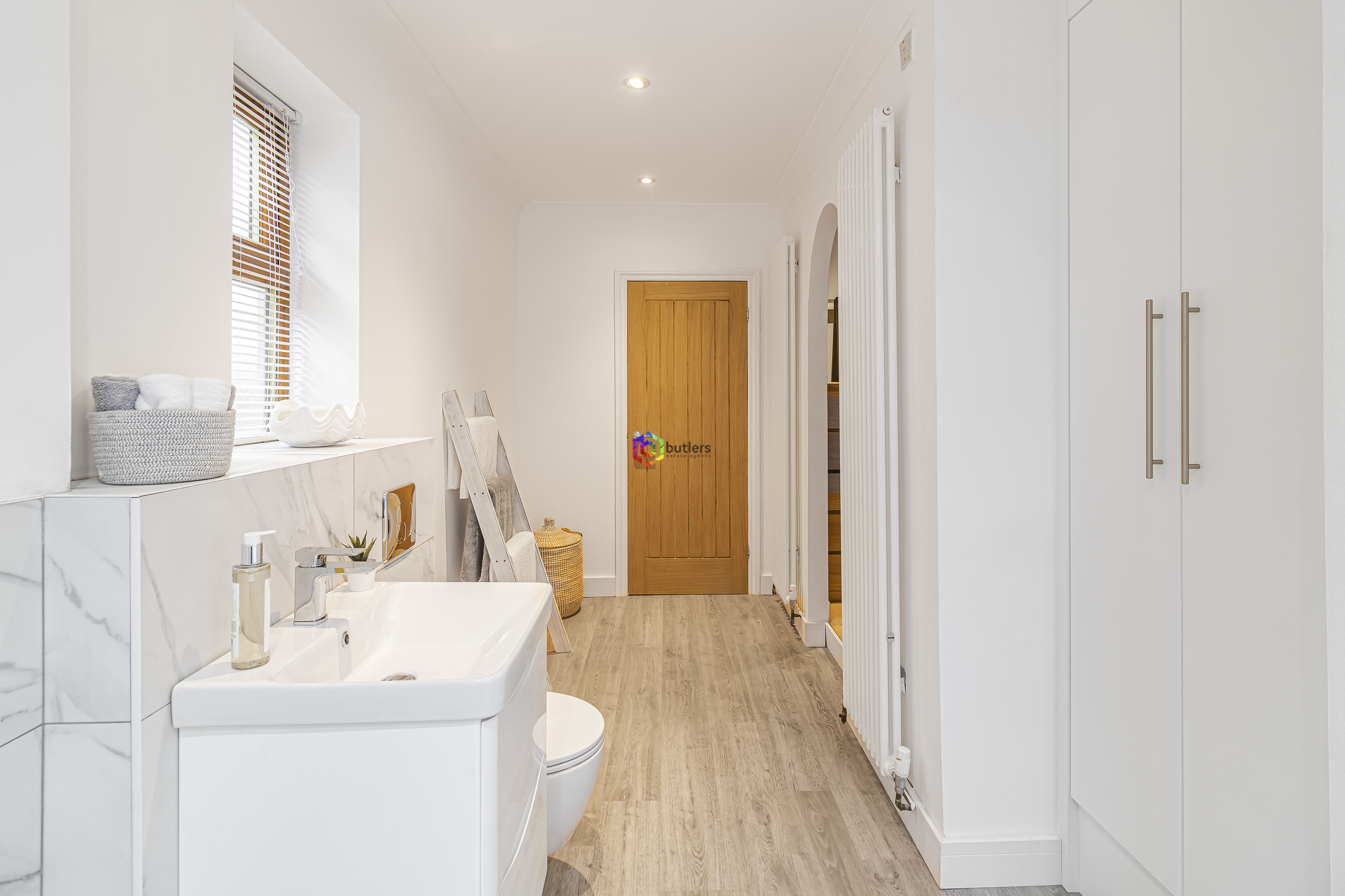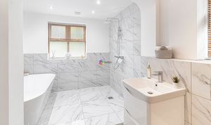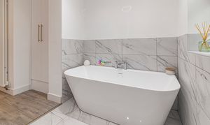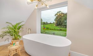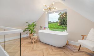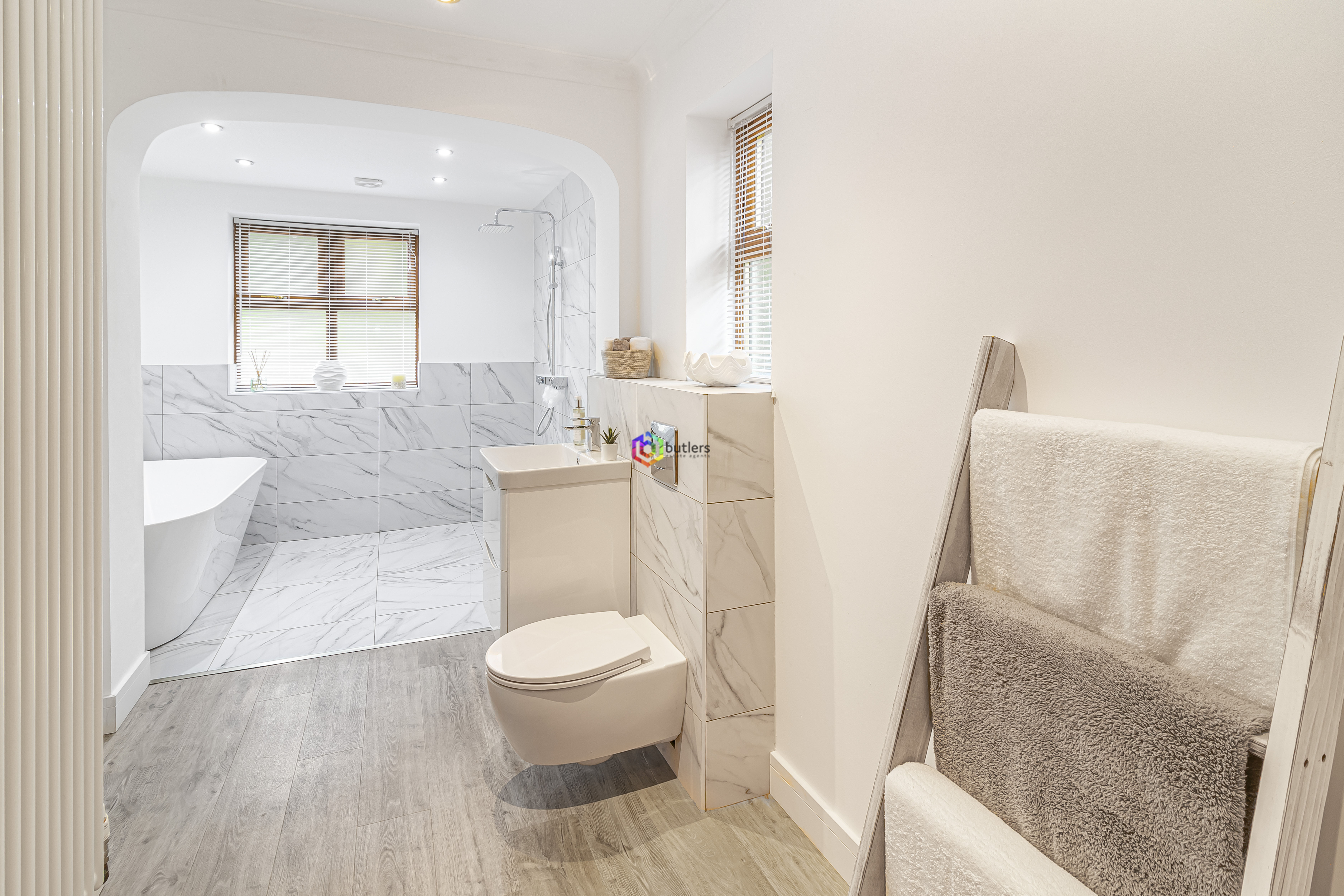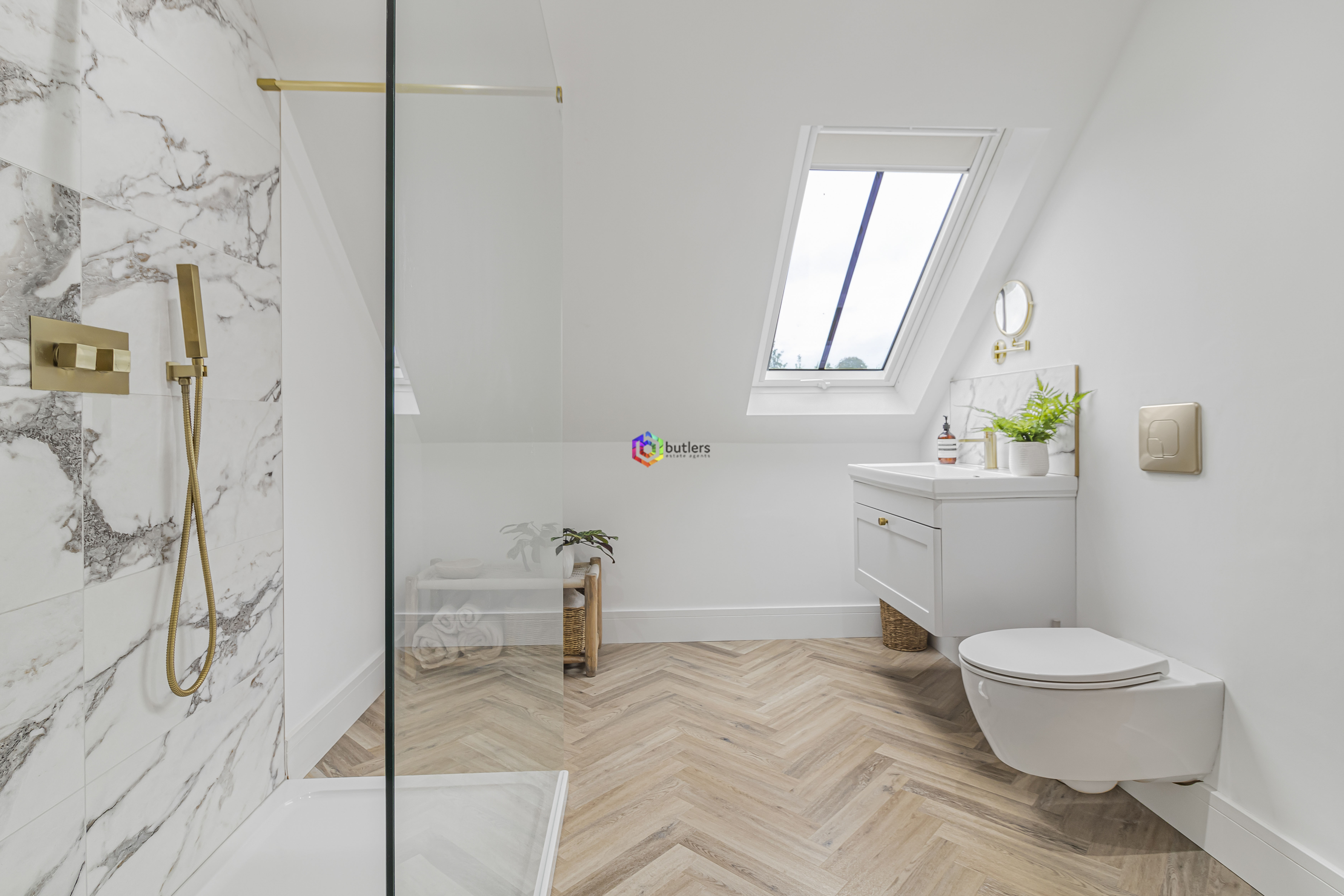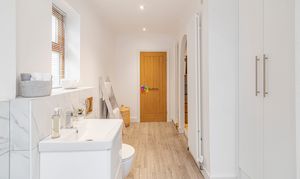 On entry to the room you are focused on the freestanding bath and wet room style shower with a front facing window, this is a large area to relax in the bath. The first part of the room has a sink in a vanity unit and a back to the wall WC. There is a wardrobe and a full dressing area providing everything you need for your daily routines.