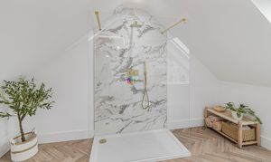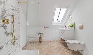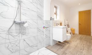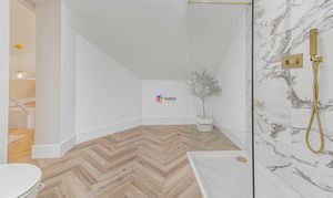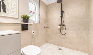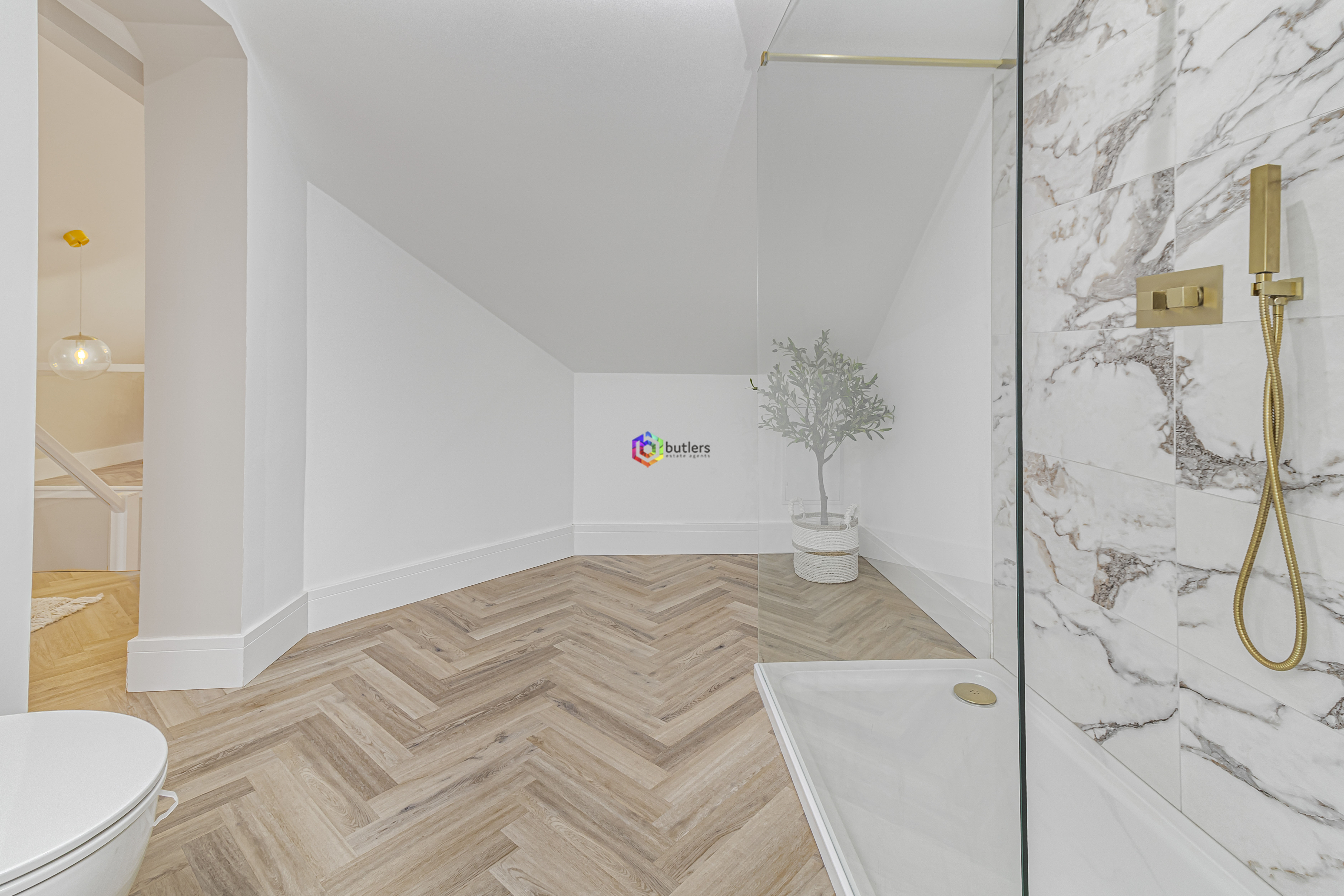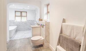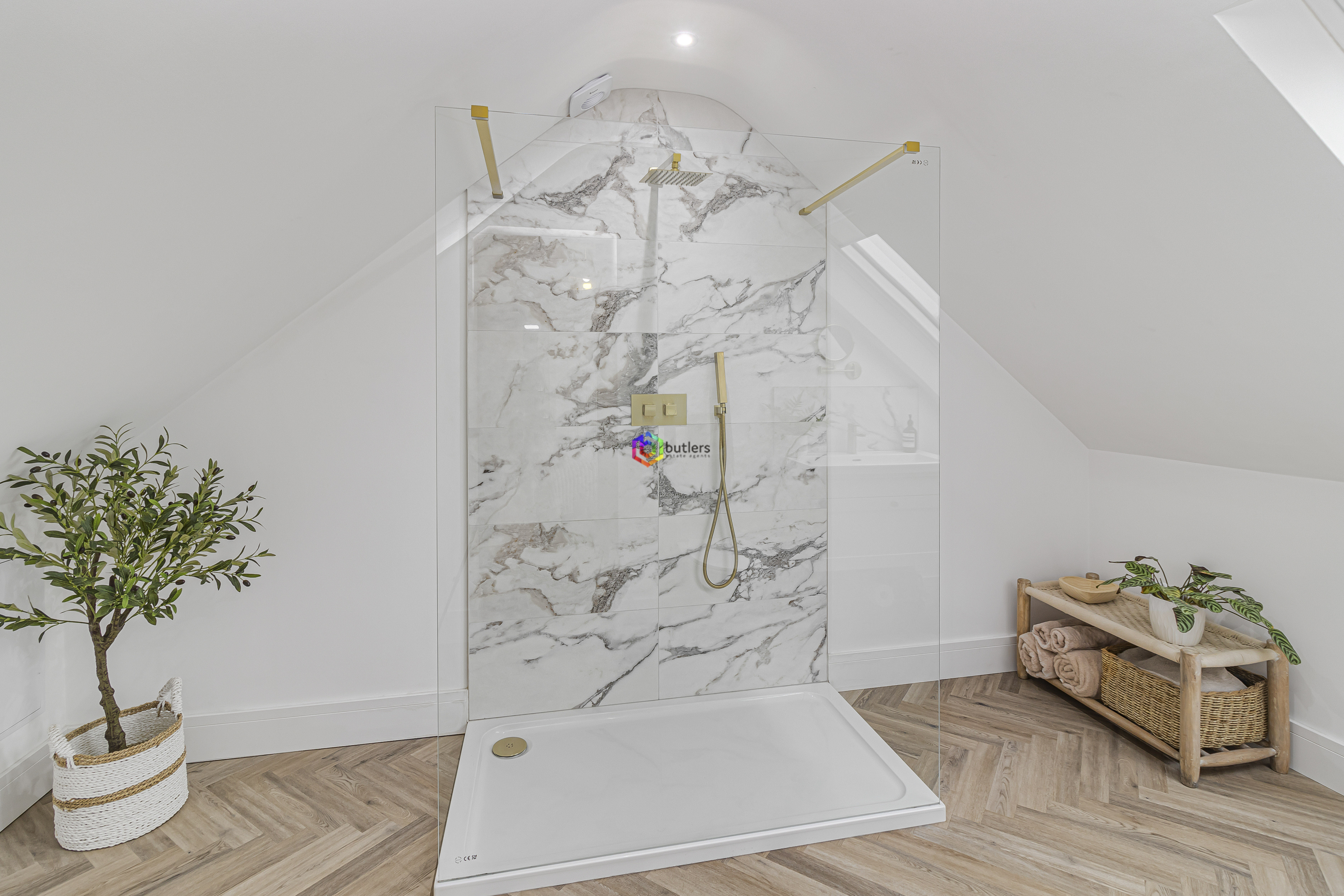 On entry to the room you are focused on the freestanding bath and wet room style shower with a front facing window, this is a large area to relax in the bath. The first part of the room has a sink in a vanity unit and a back to the wall WC. There is a wardrobe and a full dressing area providing everything you need for your daily routines.