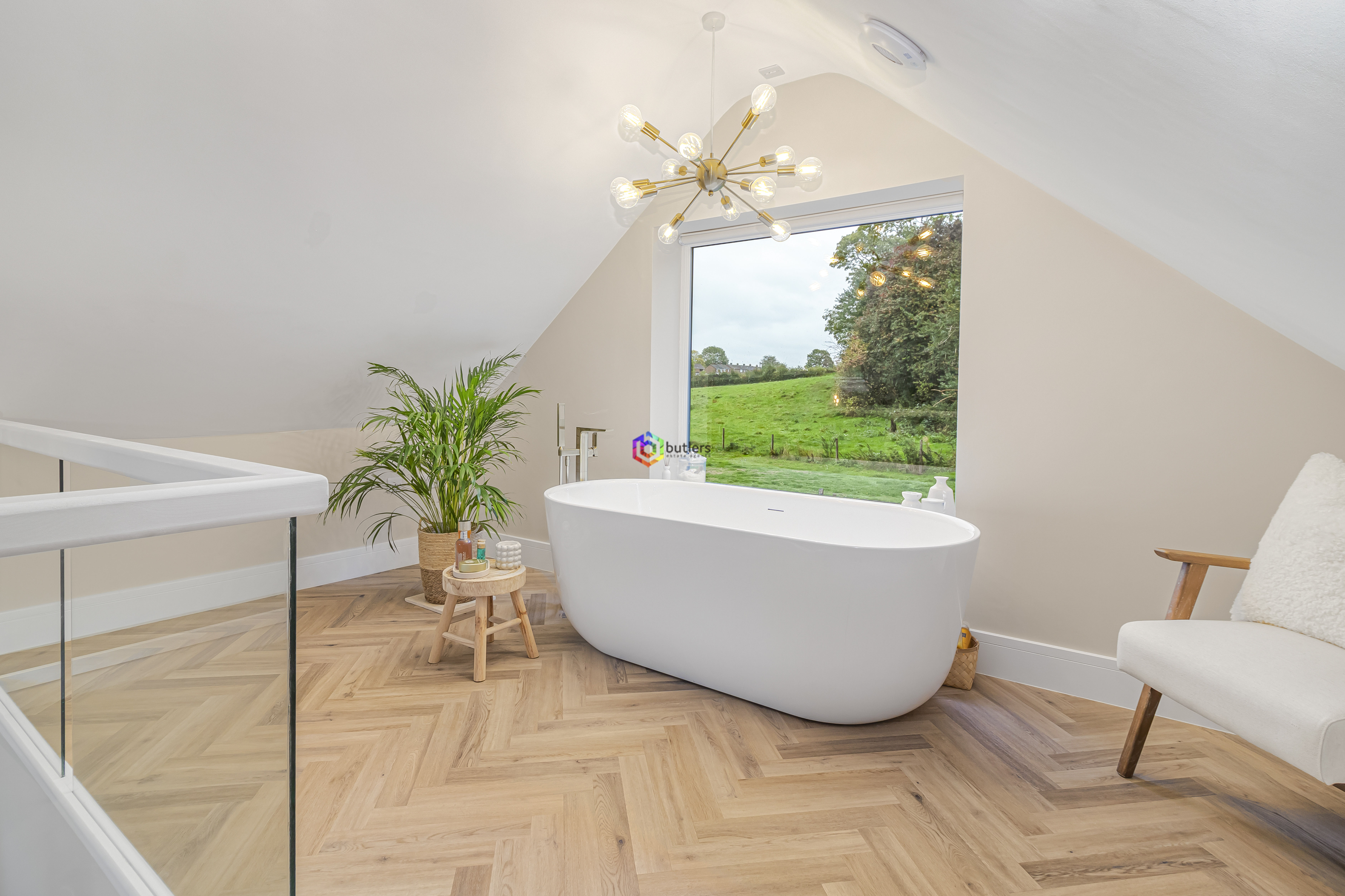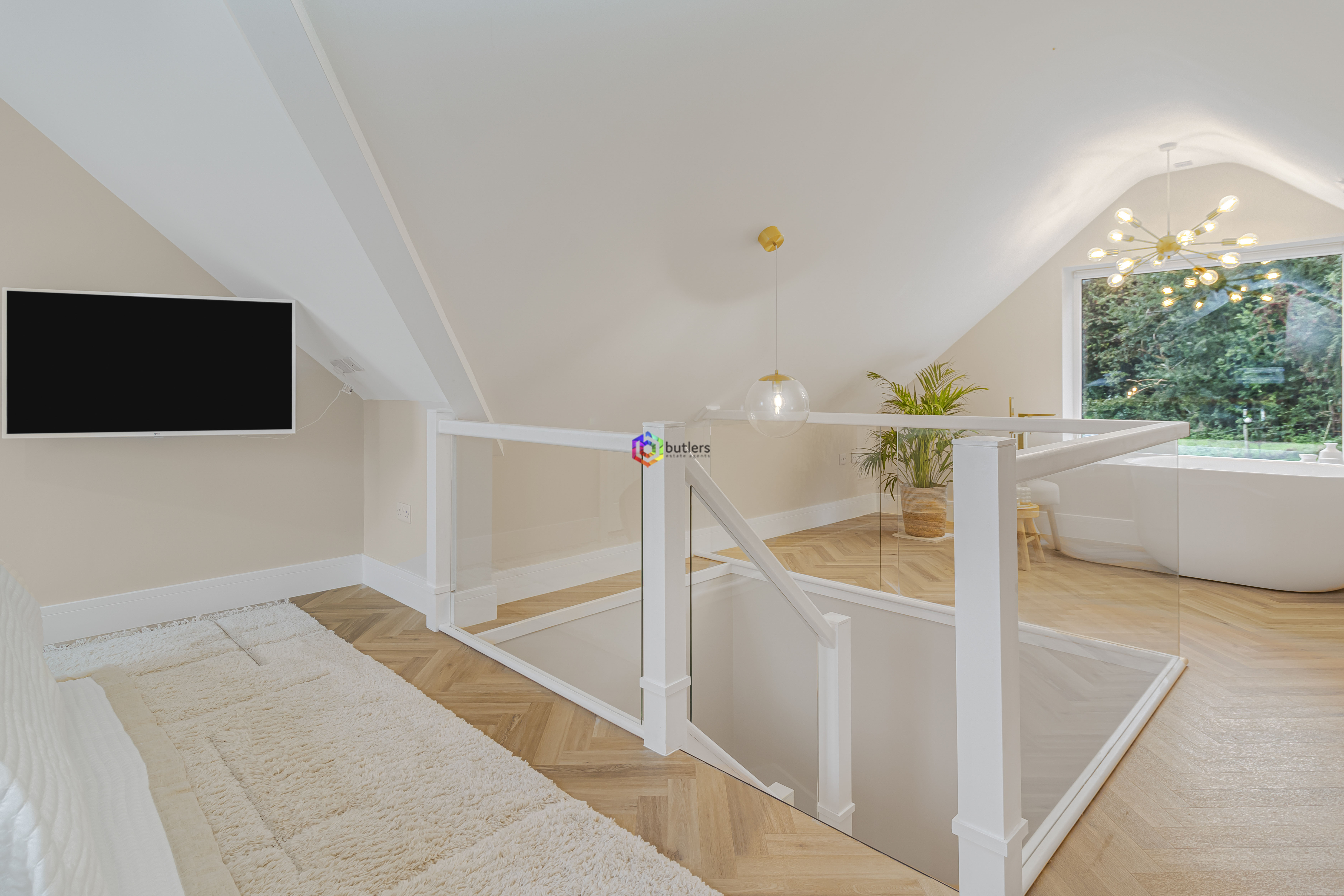 - MAIN BEDROOM SUITE WITH GLASS STAIRCASE AND LUXURIOUS FREESTANDING BATH AND SEPARATE SHOWER ROOM