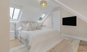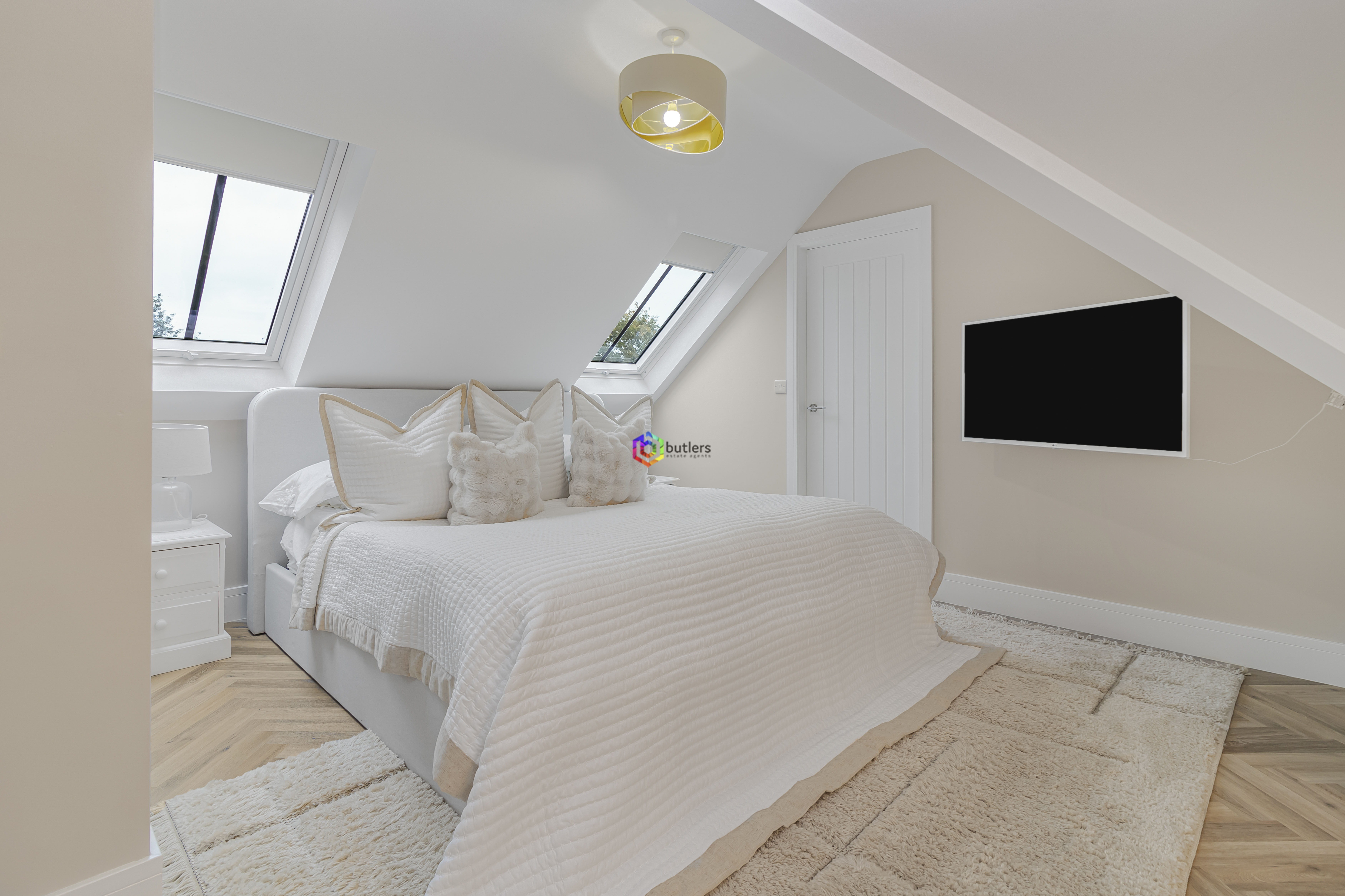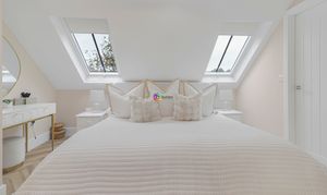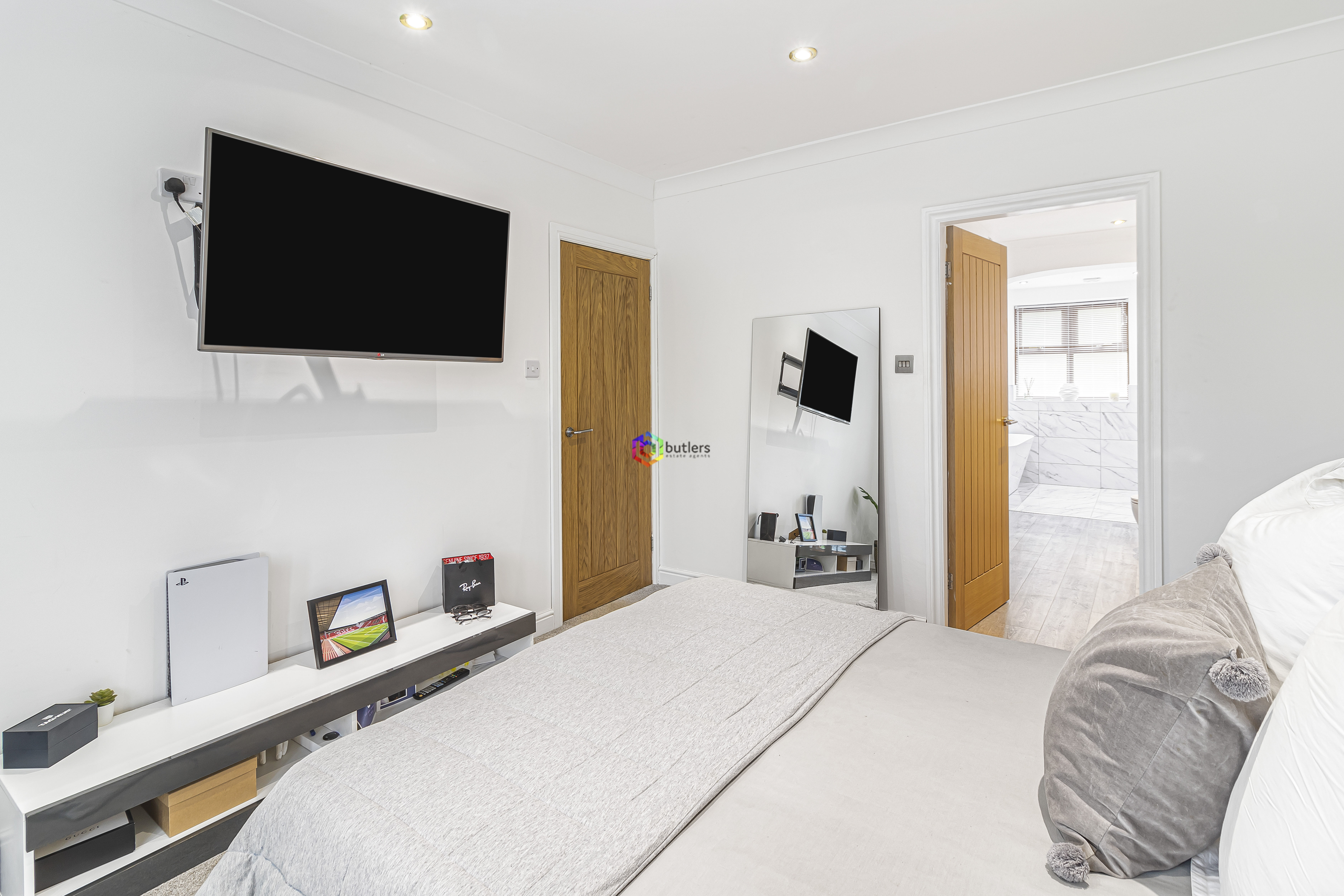 A great sized double bedroom with separate dressing area and twin windows providing natural light. A door leds to the en-suite