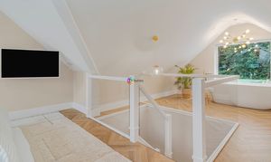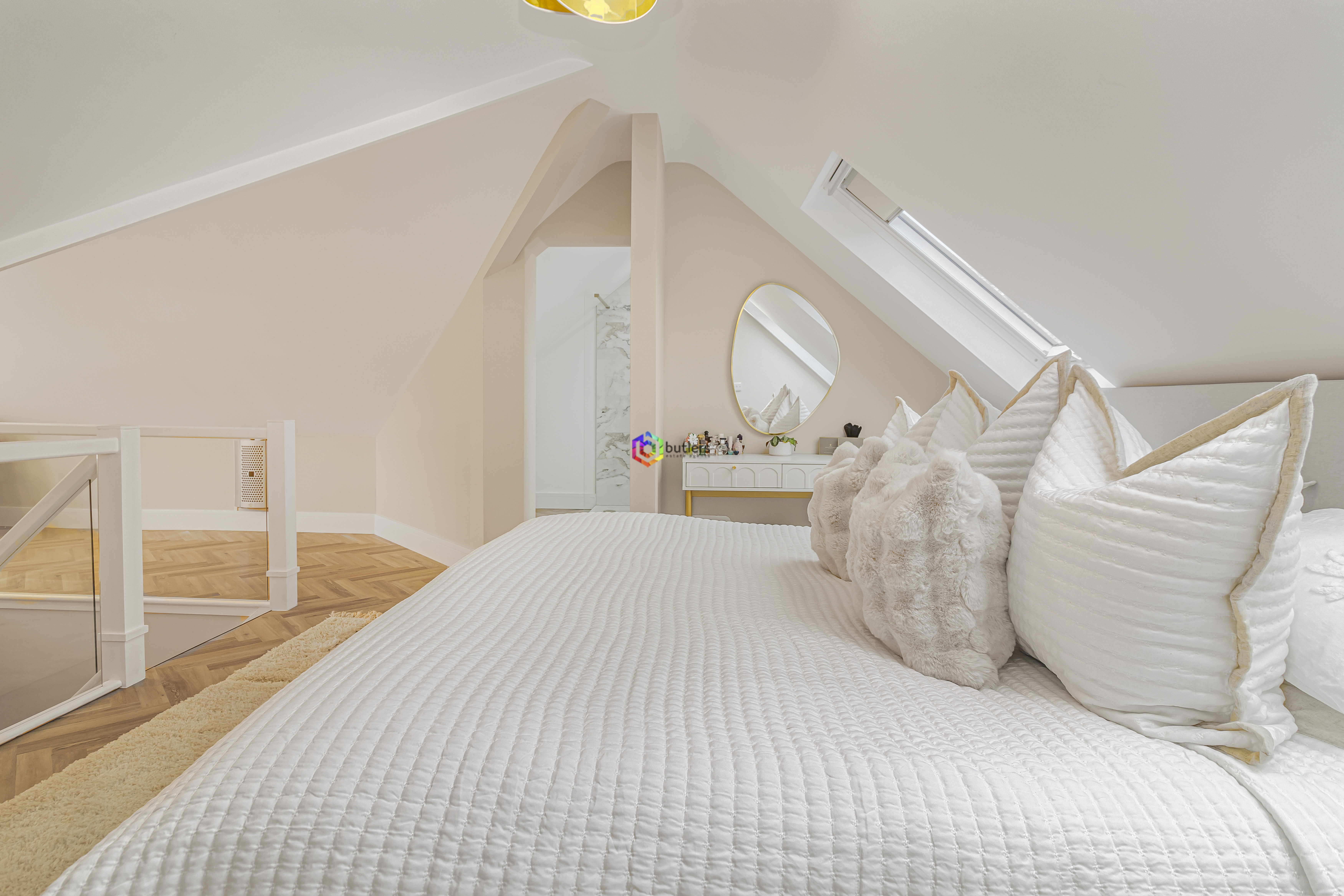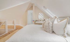 A door from the hallway on the ground floor leads into a dressing room fitted with bespoke furniture making great use of the space on offer. As you arrive at the top of the stairs you are drawn to the freestanding bath in front of the large square window to the front of the house designed to soak and look at the stars. Its such a luxurious space with air conditioning for when it gets hot. This area is again open plan to the bedroom area which has great design to form a natural area for the dressing table being hidden yet accessible. Two velux windows above the bed provide natural light. An opening leads you through to the En-Suite shower room which has a glass wall creating the shower area opposite the vanity unit housing the modern sink and back to the wall WC. A velux is located just above the sink. A door opens from the bedroom area into the dressing room with two long rail areas for your designer apparel. A further door leads from this room to the services area.