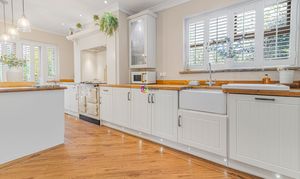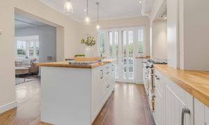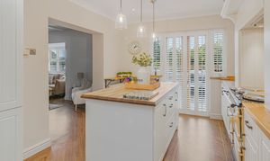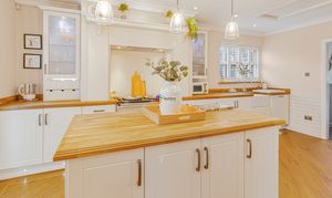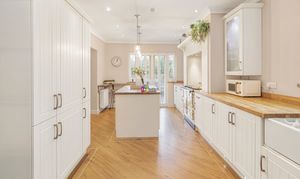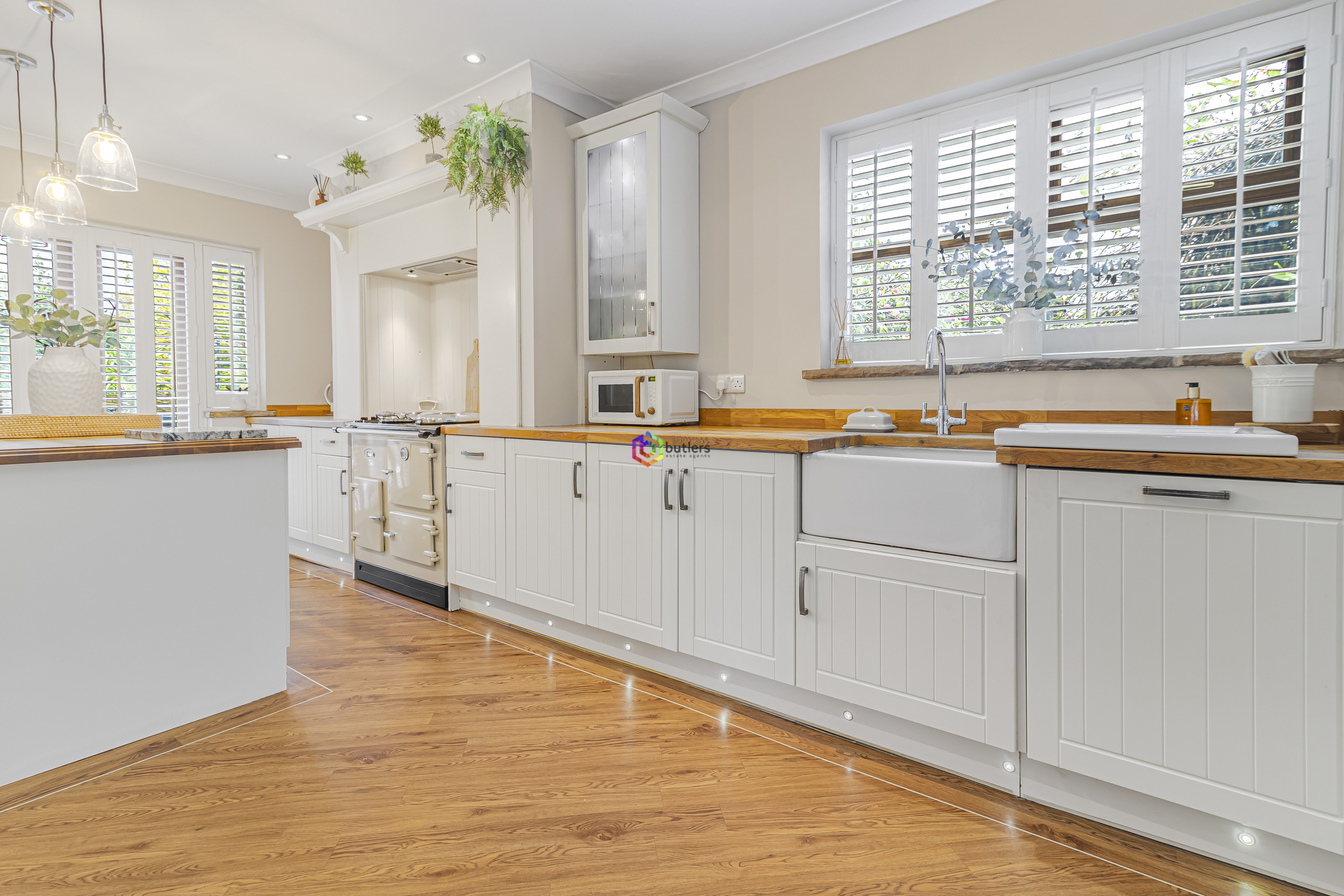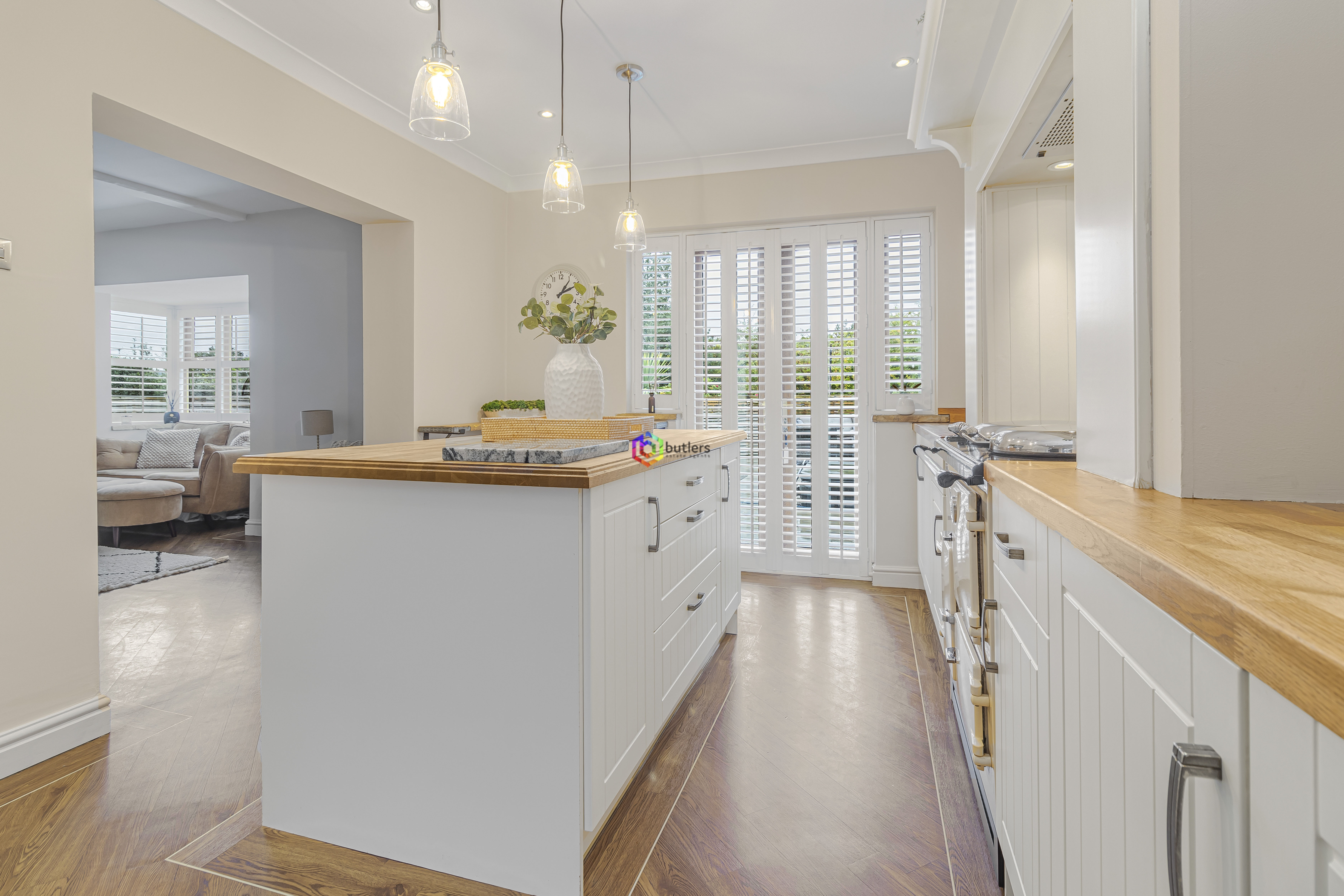 Take a look at this amazing kitchen / breakfast room fitted with a range of wall and floor mounted units in white with oak block style worksurfaces, lots of storage and a pleasure for any chef to work in. There is a range cooker cleverly designed as the focal point of the room with the adjacent island providing more space. Integrated fridge, freezer and dishwasher along with the seating area next to the twin doors leading to the rear garden provide all the expected benefits of a luxury home like this. An open plan design leads through to a formal lounge area creating a great space for families and entertaining alike.