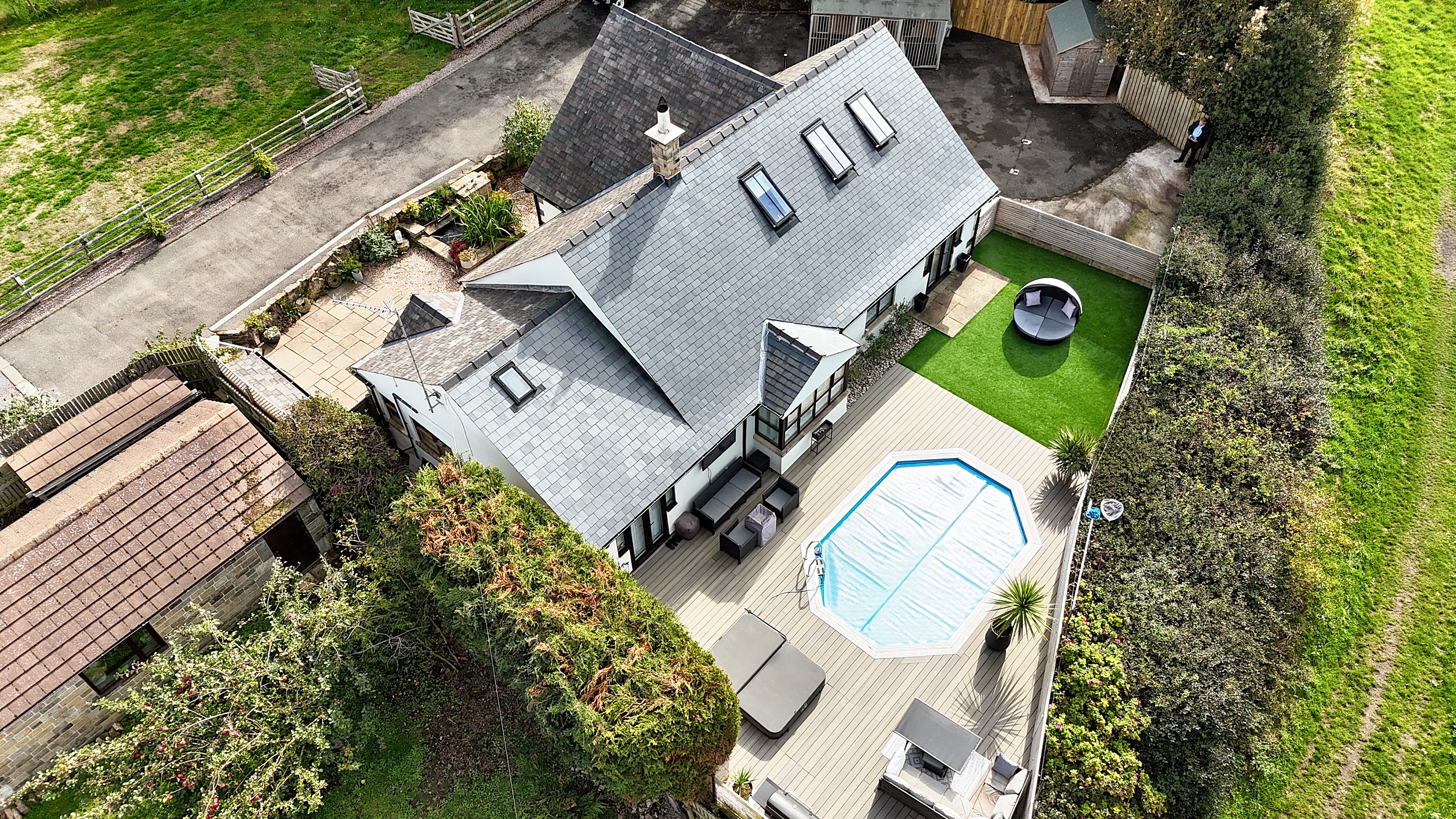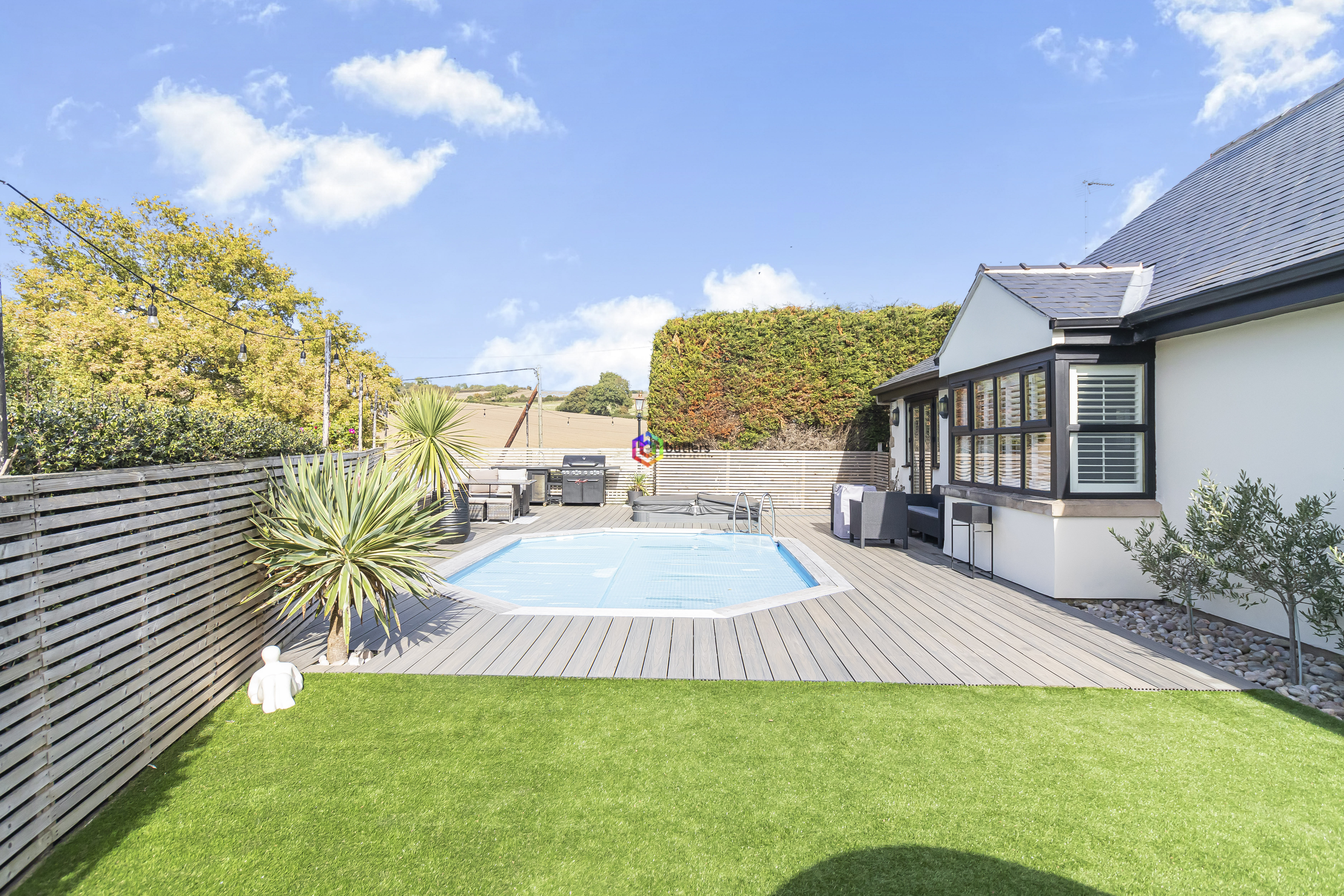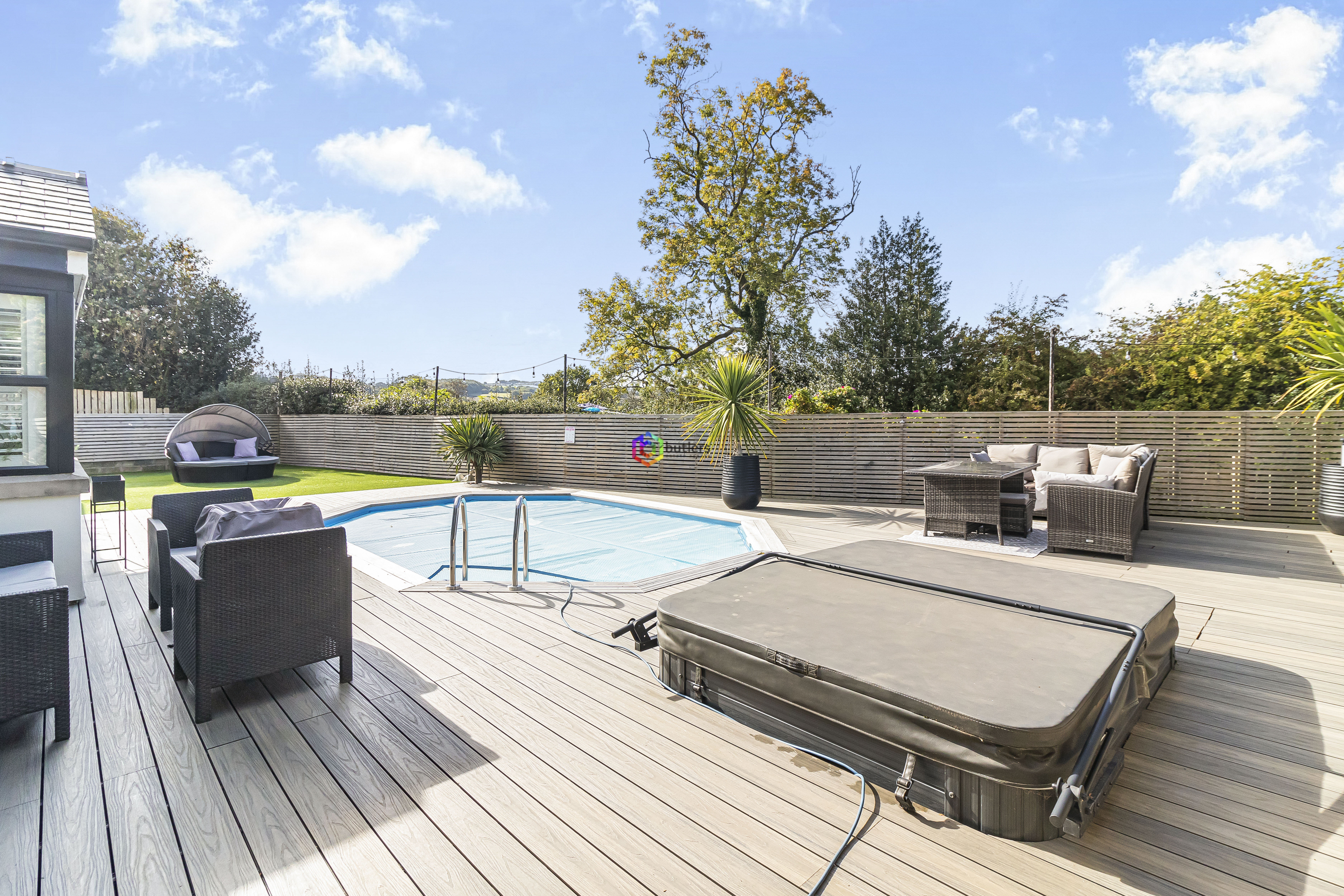 From entering the property through the electric gates and proceeding along the driveway you are adjacent to a paddock, viewers are advised to check title deeds for the land being sold and the further land available to rent. The rear garden with views has been well designed to incorporate a hot tub, heated swimming pool and areas to relax and unwind in the sunshine. Grass areas hosting a love seat complement the space.