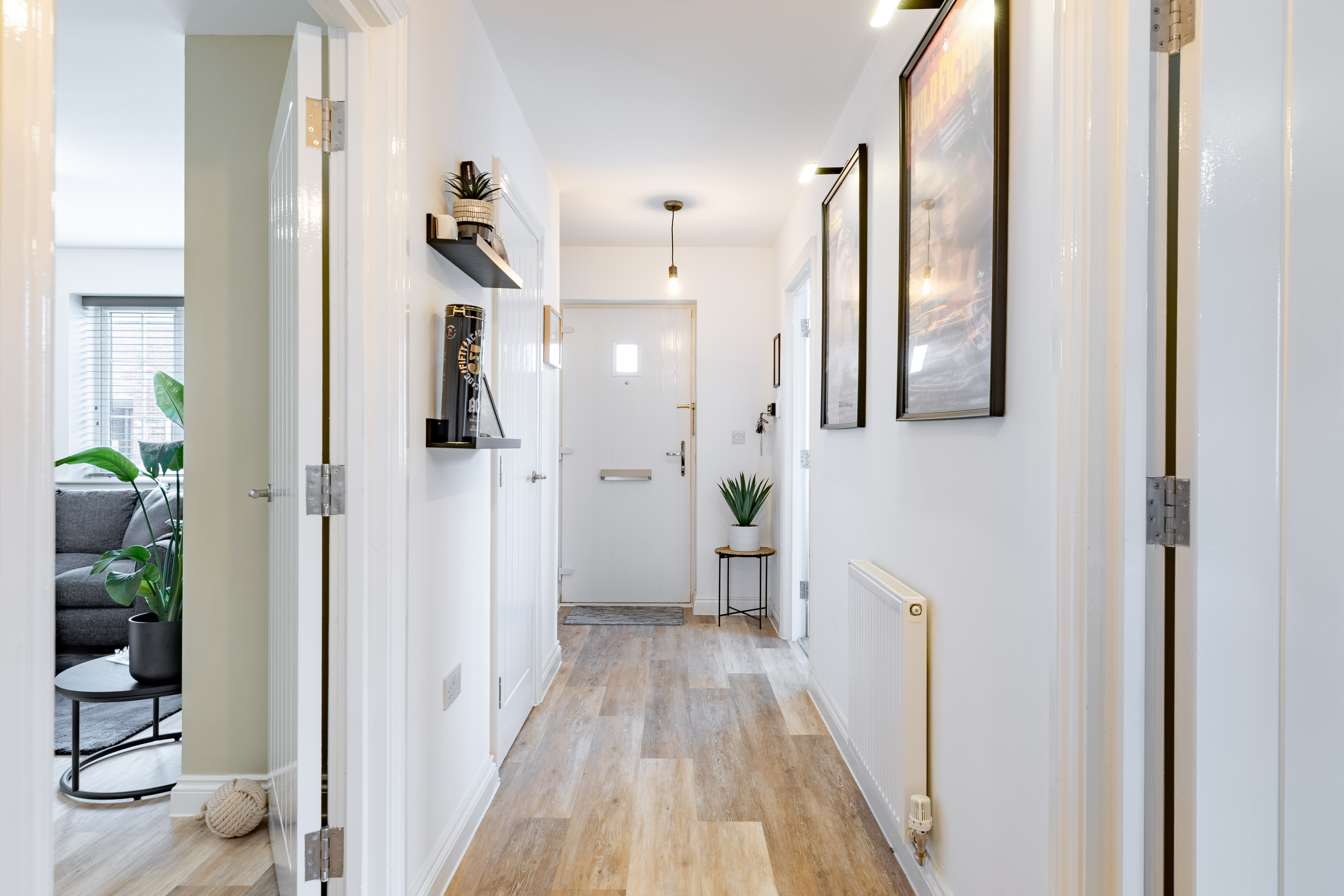 The home opens into a welcoming hallway with two generous storage cupboards before leading into the heart of the property – a large open-plan kitchen, living and dining space designed for modern lifestyles. The kitchen features granite worktops and sleek units, flowing seamlessly into the bright living and dining area, perfect for entertaining or relaxing.