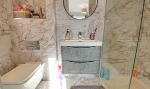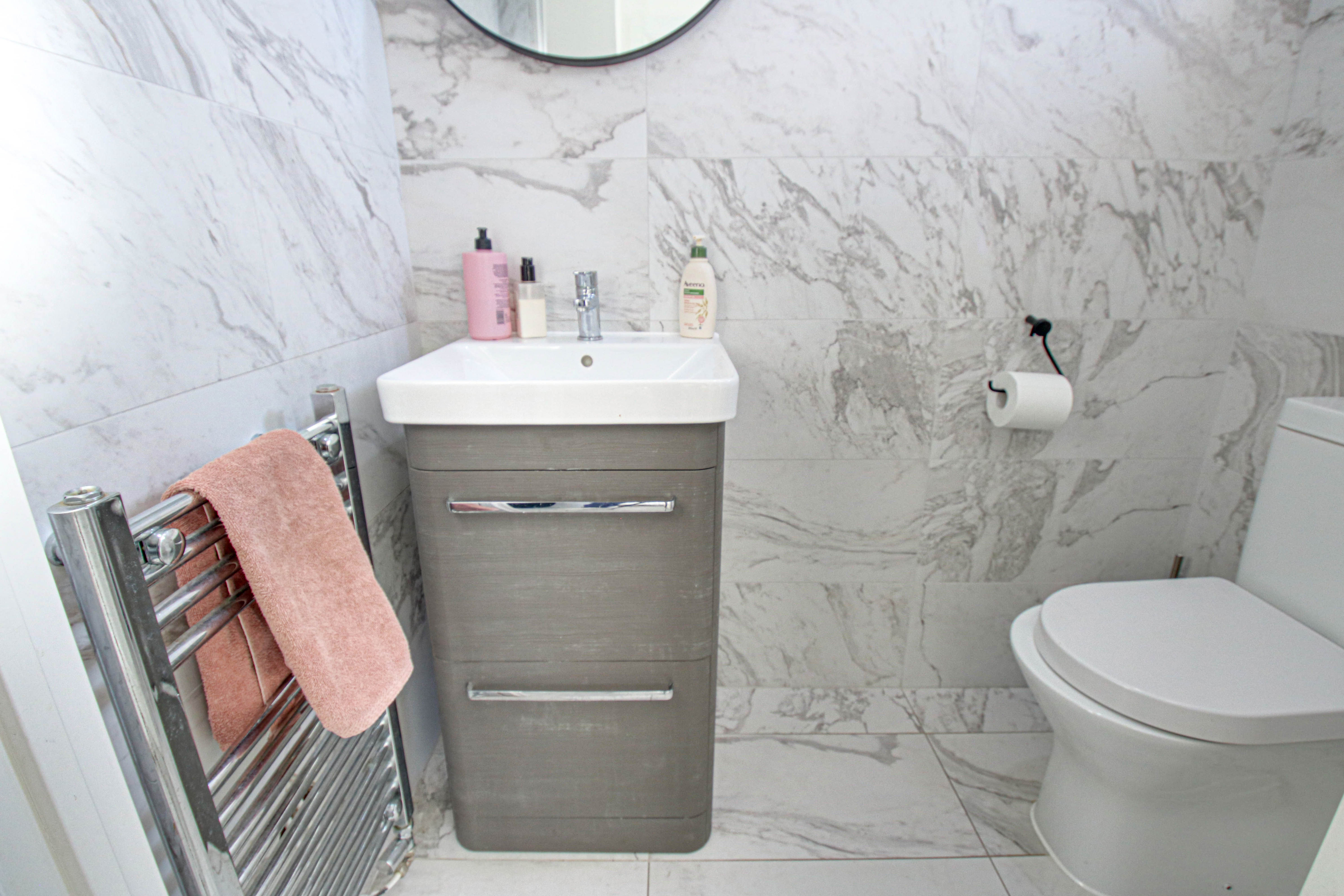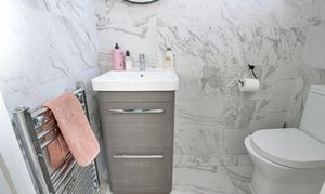 Side facing upvc double glazed window, three piece suite, Porcelain tiled walls, flooring with under floor heating and heated towel radiator.
