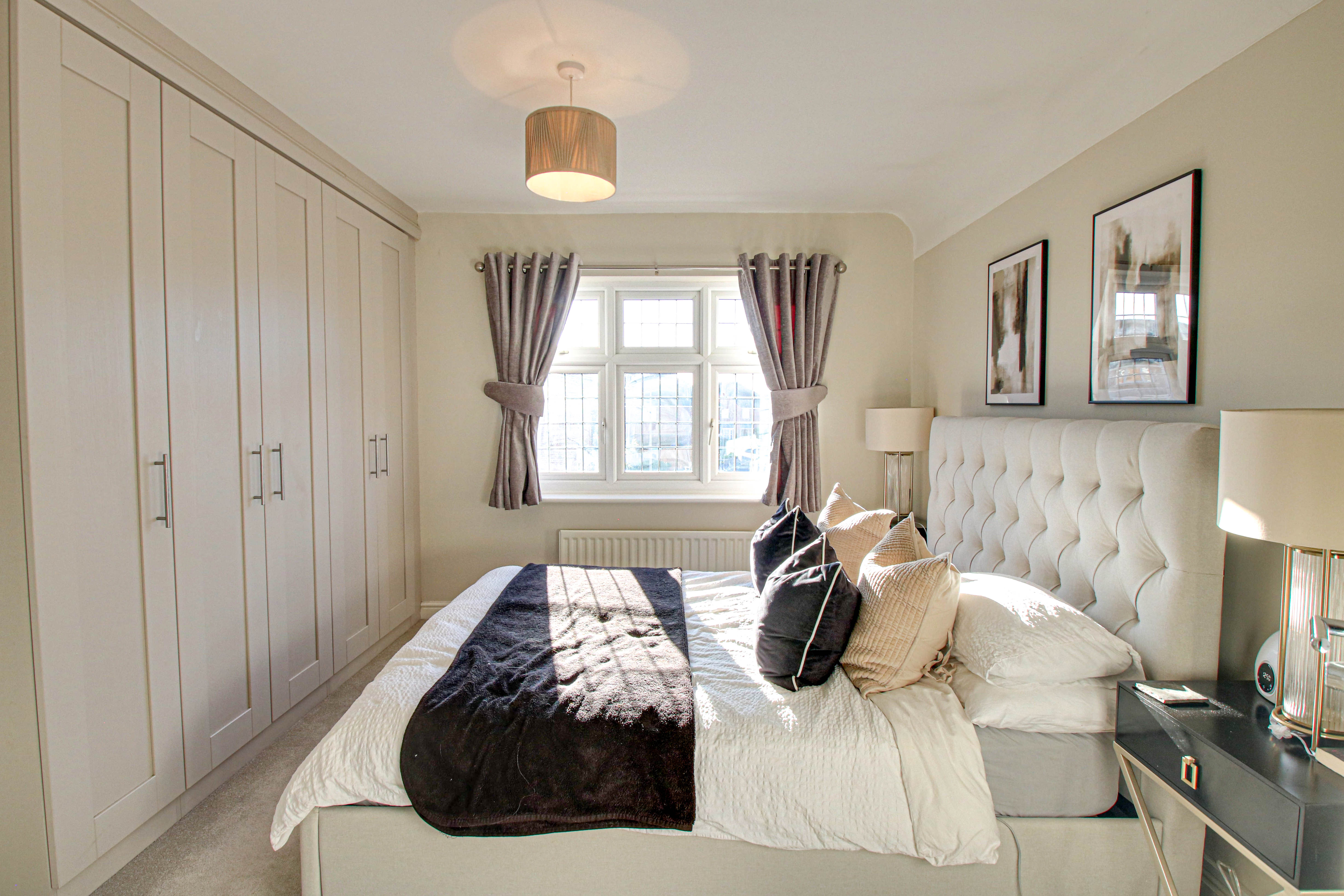 Rear facing upvc double glazed window, fitted wardrobes and radiator.