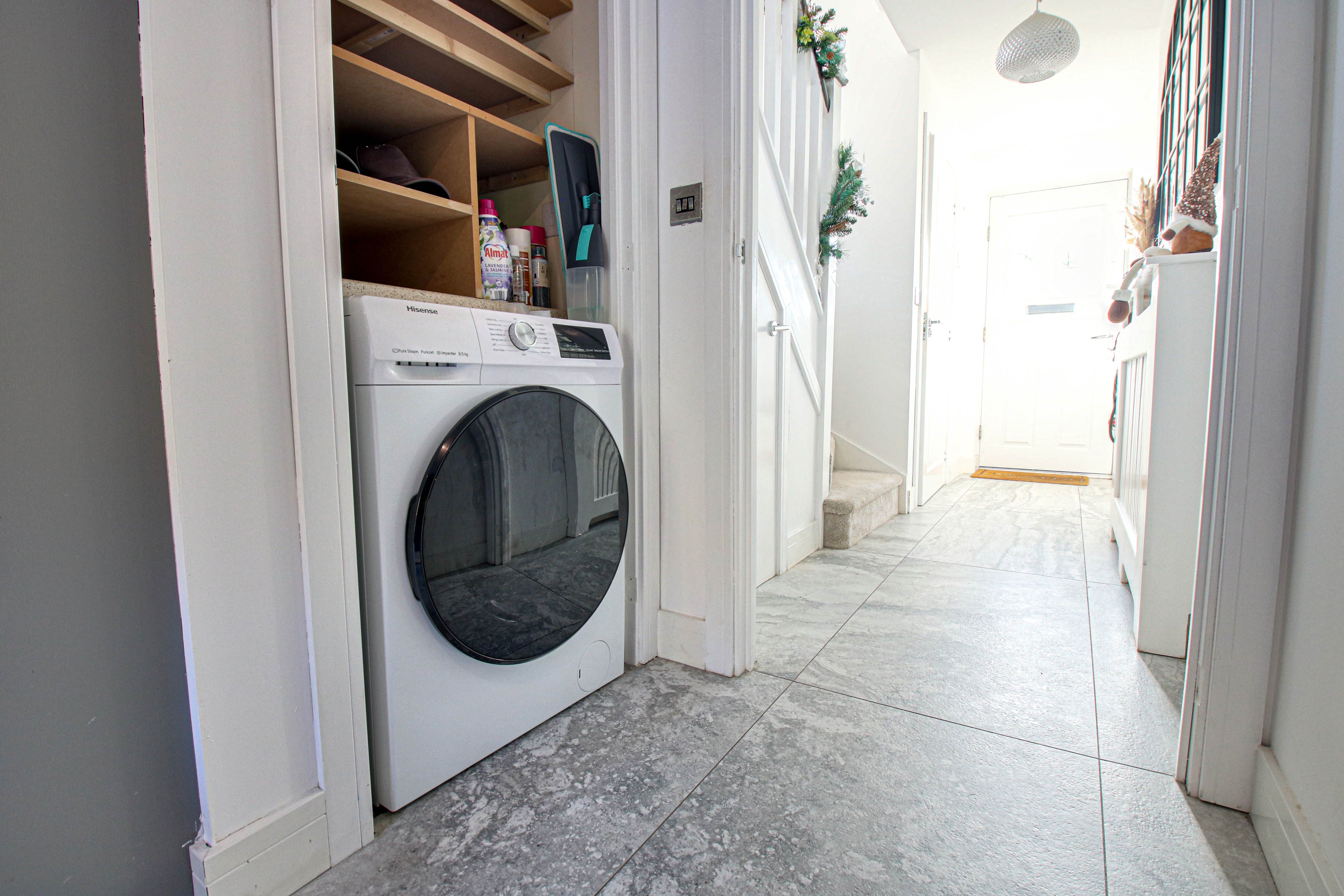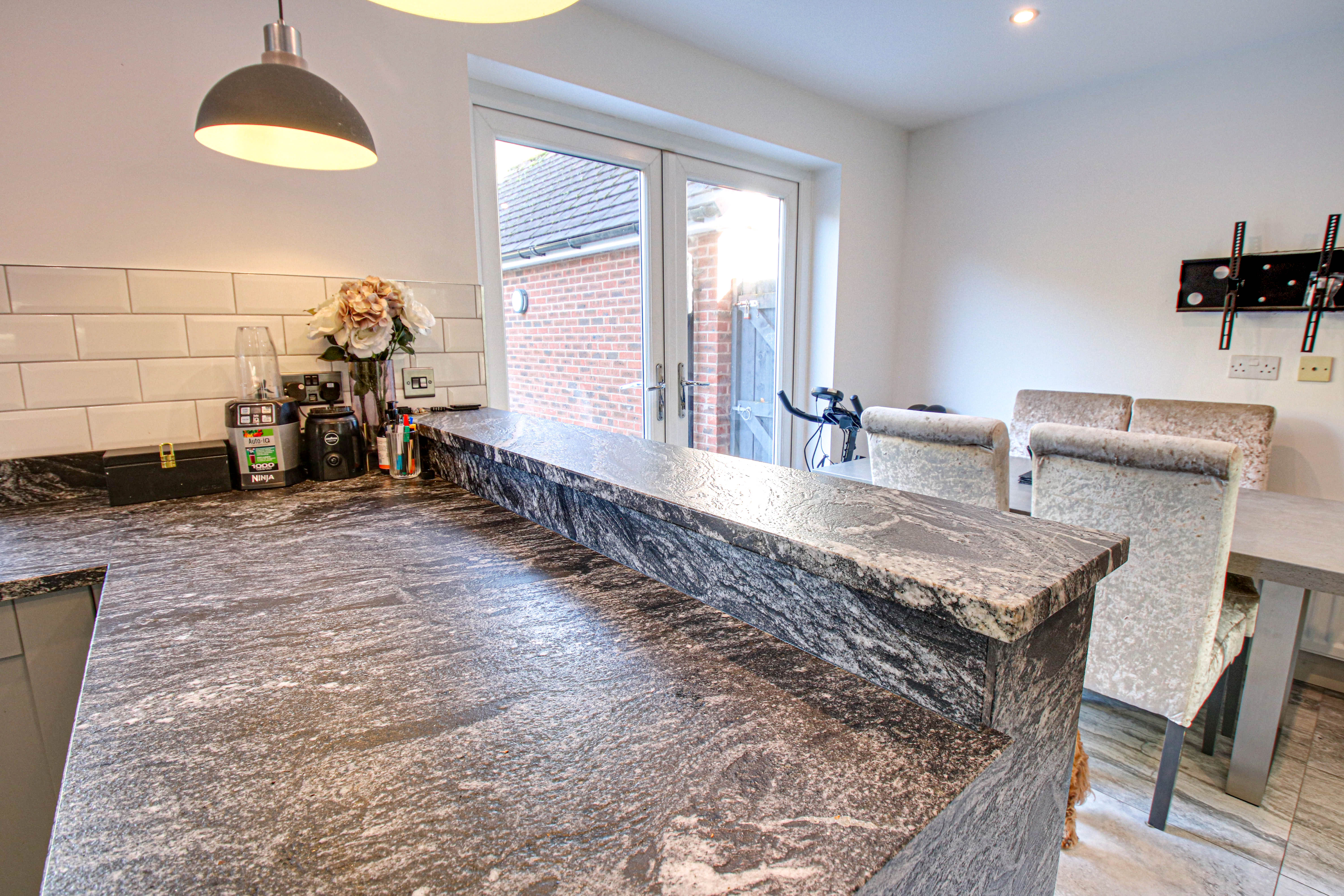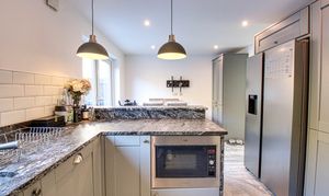 Rear facing upvc double glazed window and french doors, fitted range of base and wall units, integral dishwasher and microwave, Stunning Granite work surfaces, Hot water tap, Porcelain tiled flooring and radiator.