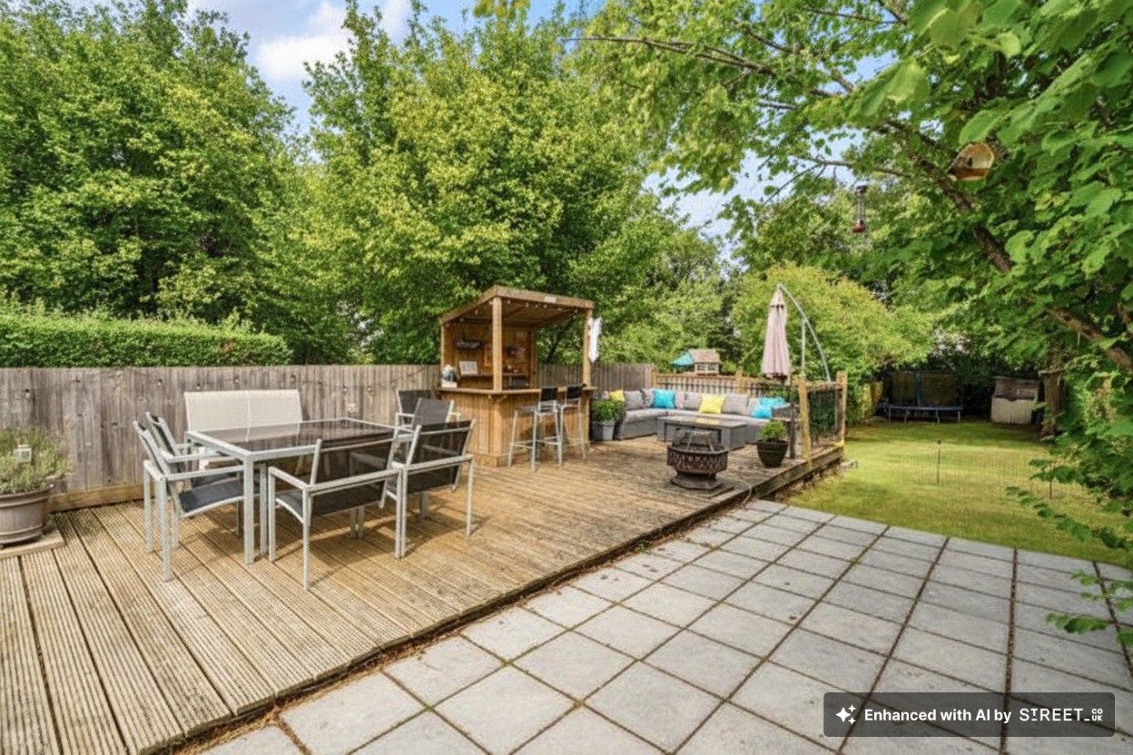 To the front is a driveway for several vehicles and to the rear is an enclosed garden of around 140’ with a large patio and decking area with bar.