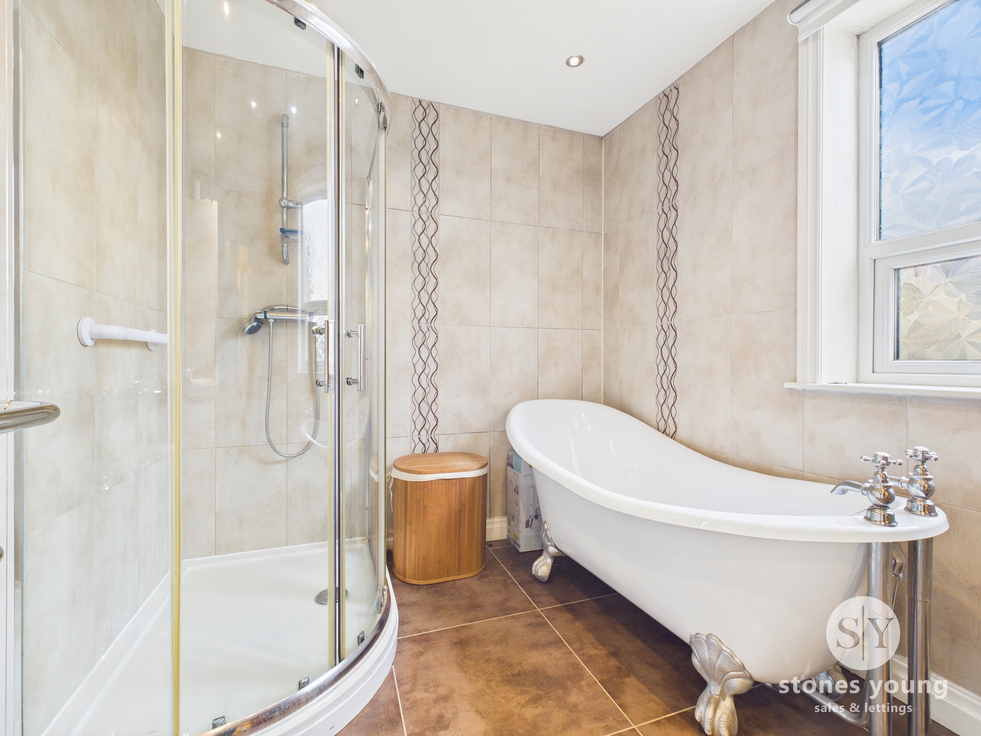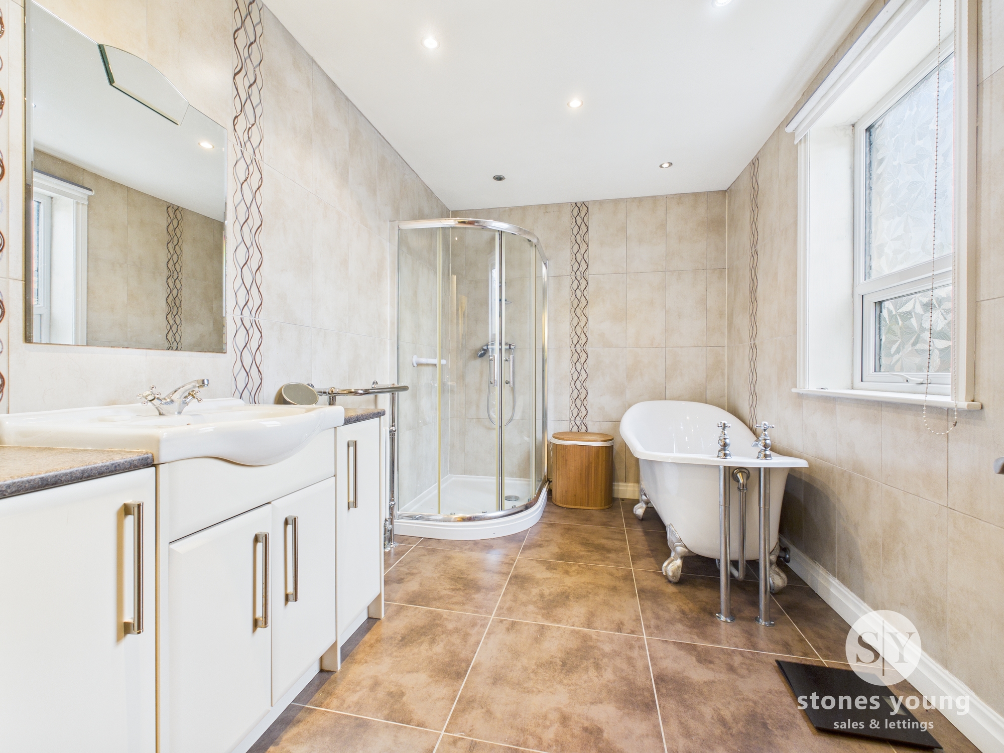 Four piece suite with freestanding roller bath, shower enclosure, vanity unit with large storage cupboard housing sink, wc, heated towel rail, tiled flooring, tiled floor to ceiling, upvc double glaze frosted window