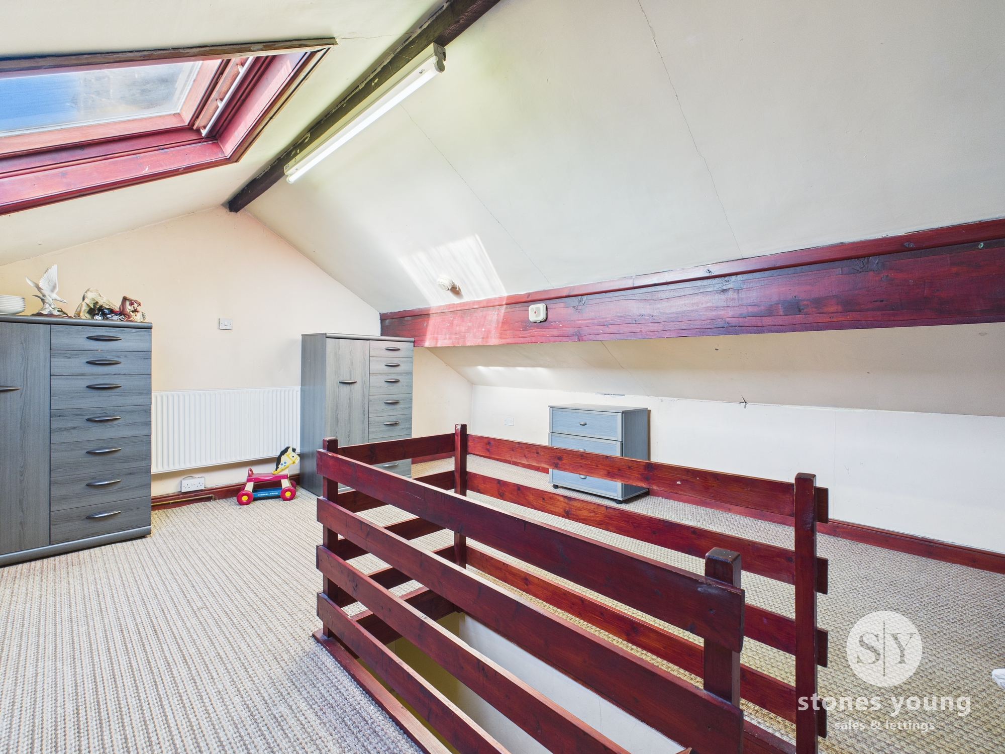 Attic room with fully fitted stairs, panel radiator, eaves storage, double glazed Velux window