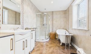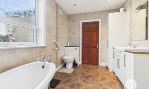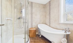 Upstairs, the property continues to impress with three well-proportioned bedrooms. Clever storage has been incorporated on the landing, maximising available space and ensuring a clutter-free environment. The family bathroom is a particular highlight, beautifully appointed with a four-piece suite. It features a luxurious roll top bath, a separate shower enclosure, generous storage and vanity unit, sink, and WC. The bathroom is fully tiled from floor to ceiling, creating a stylish and practical space.