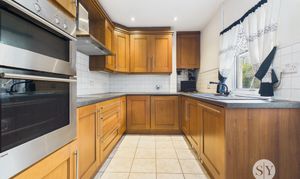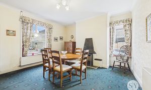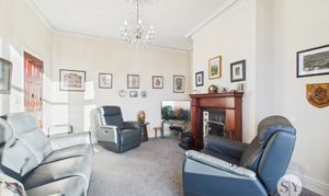 Upon entering, you are greeted by a welcoming hallway leading to two large reception rooms. The principal lounge is a bright and inviting space, featuring a striking bay window that floods the room with natural light. An open coal fire creates a charming focal point, ideal for relaxing evenings. The second reception room also boasts a coal fire and provides exceptional versatility, serving equally well as a formal dining room, additional living space, or a playroom to suit your lifestyle needs. The kitchen is situated to the rear of the property and has been fitted with a range of integrated appliances. It is presented in excellent condition, offering ample workspace and storage.
