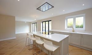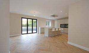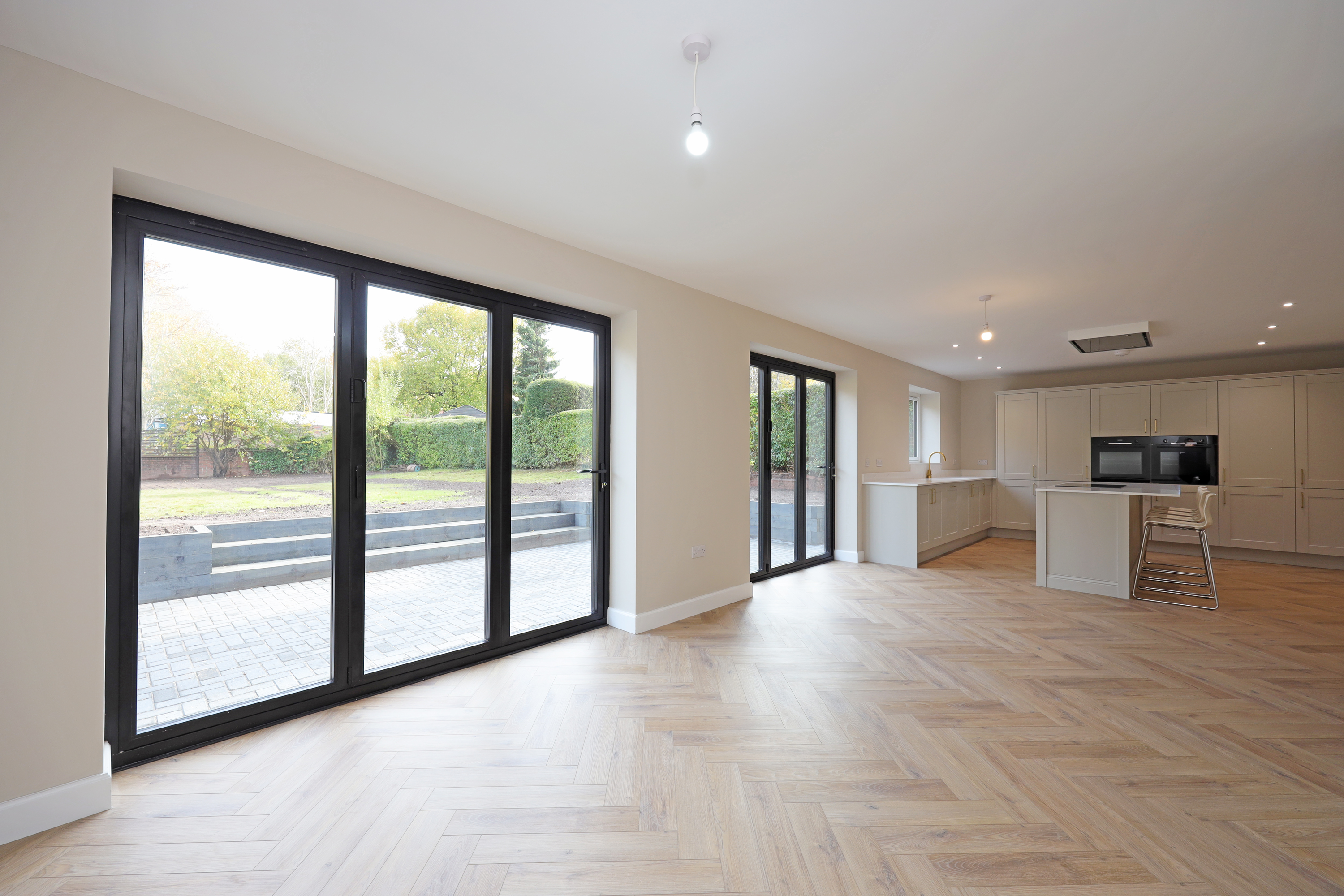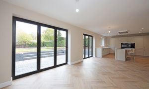 Large enclosed front entrance porch leading to a reception hallway with turned staircase having under storage and cloakroom suite with WC and table top wash basin. There is a large formal living room with front facing bay window and further glazing to side aspect. The living room can be accessed separately from either the hallway or the family dining kitchen which provides a most impressive family living space, to include a twin set of triple Bi-folding doors opening out onto the rear patio. The kitchen area is fully equipped with slimline quartz work surfaces having inset sink and an extensive range of base and tall units with integrated dishwasher, fridge freezer, and twin side-by-side centre piece electric ovens. There is also a matching style island unit/breakfast bar with pan drawers and large insect induction hob having ceiling mounted extractor above. Accessed from the kitchen is a utility with side external access door and further base units with provision for washing machine/dryer. There is also internal access to a large single integral garage with up and over door and housing the central heating system to include boiler and pressurised water cylinder.