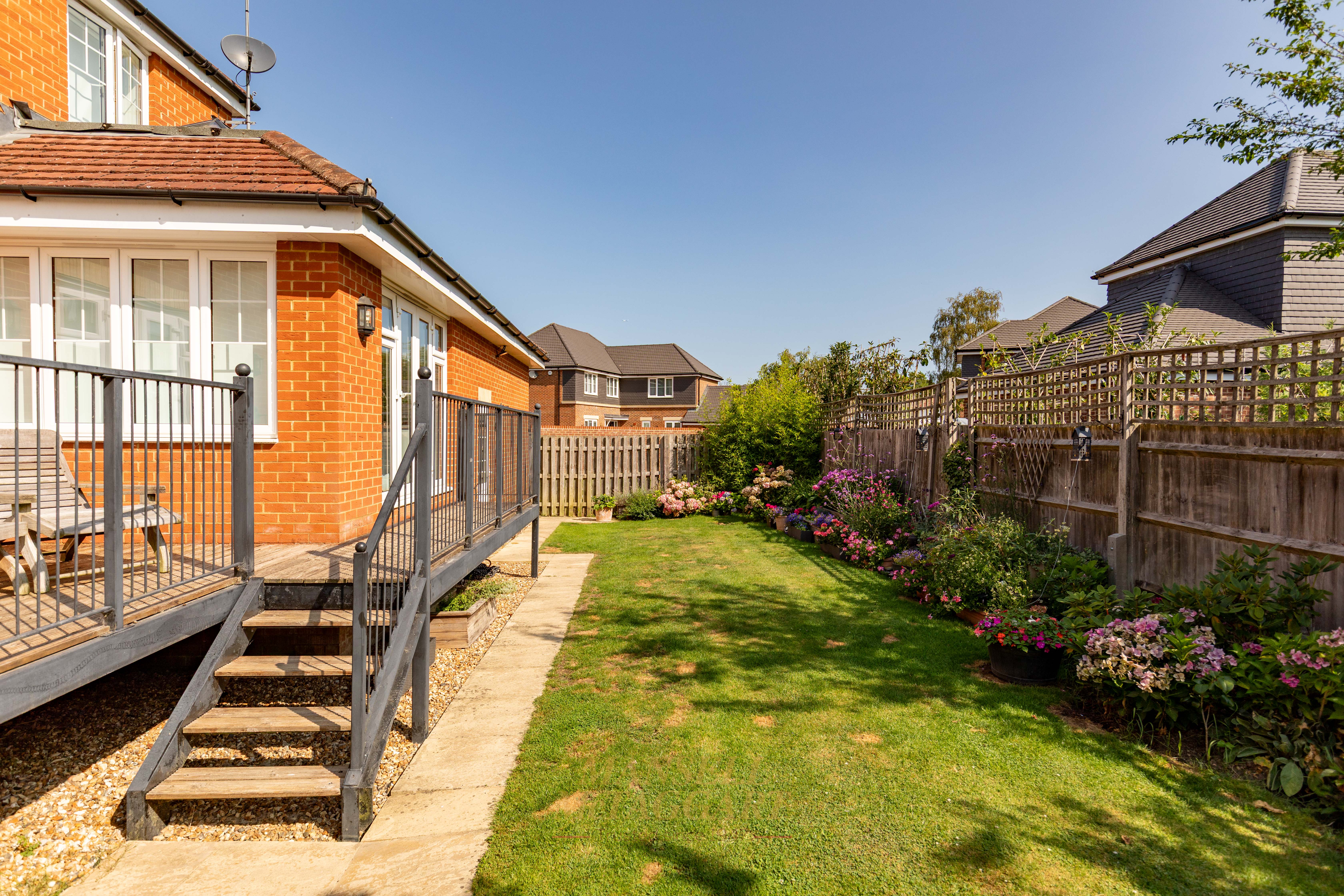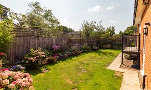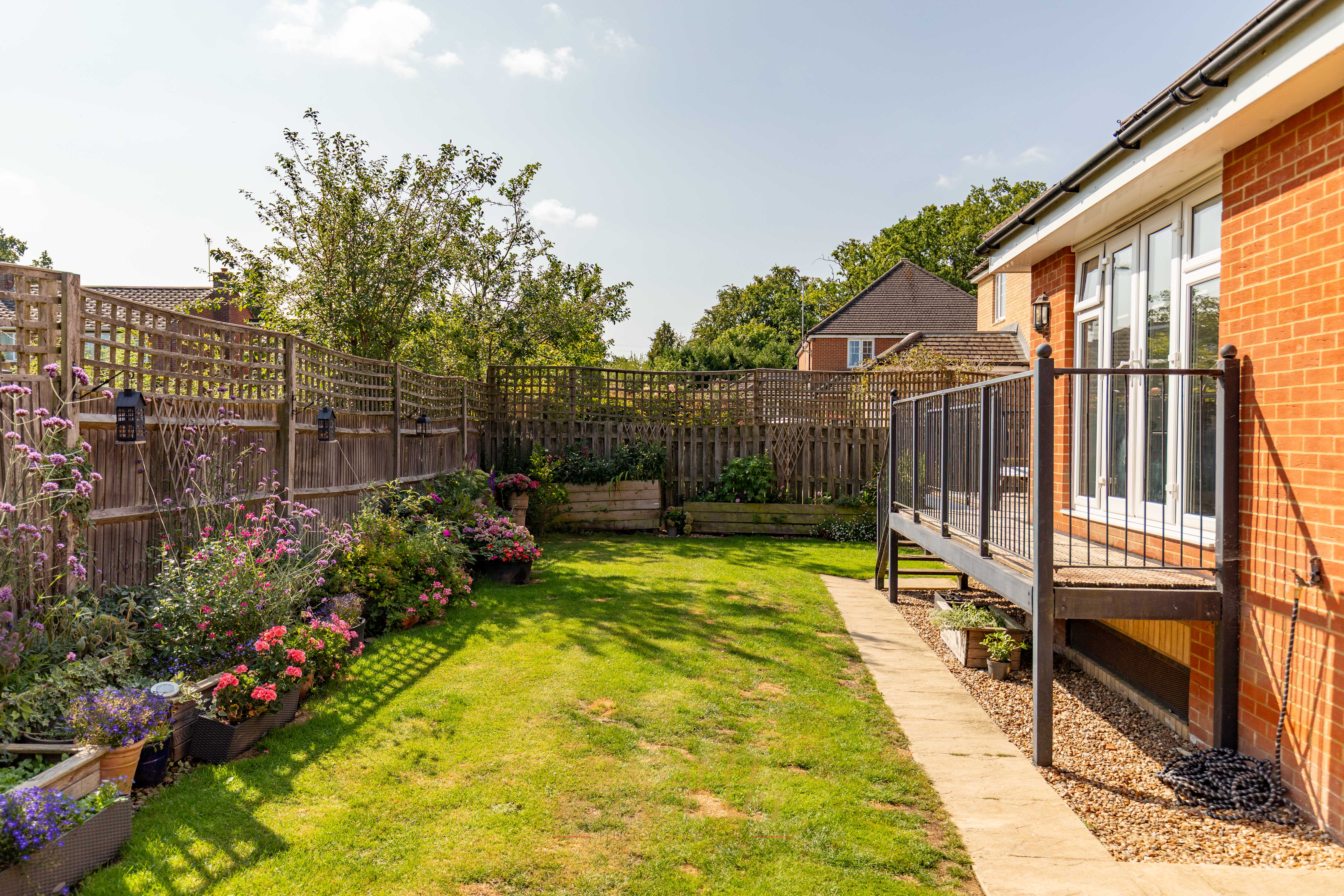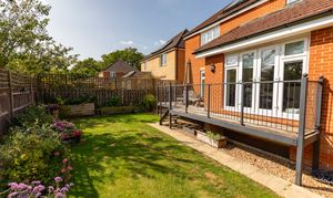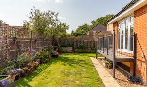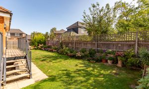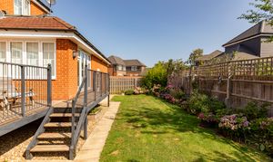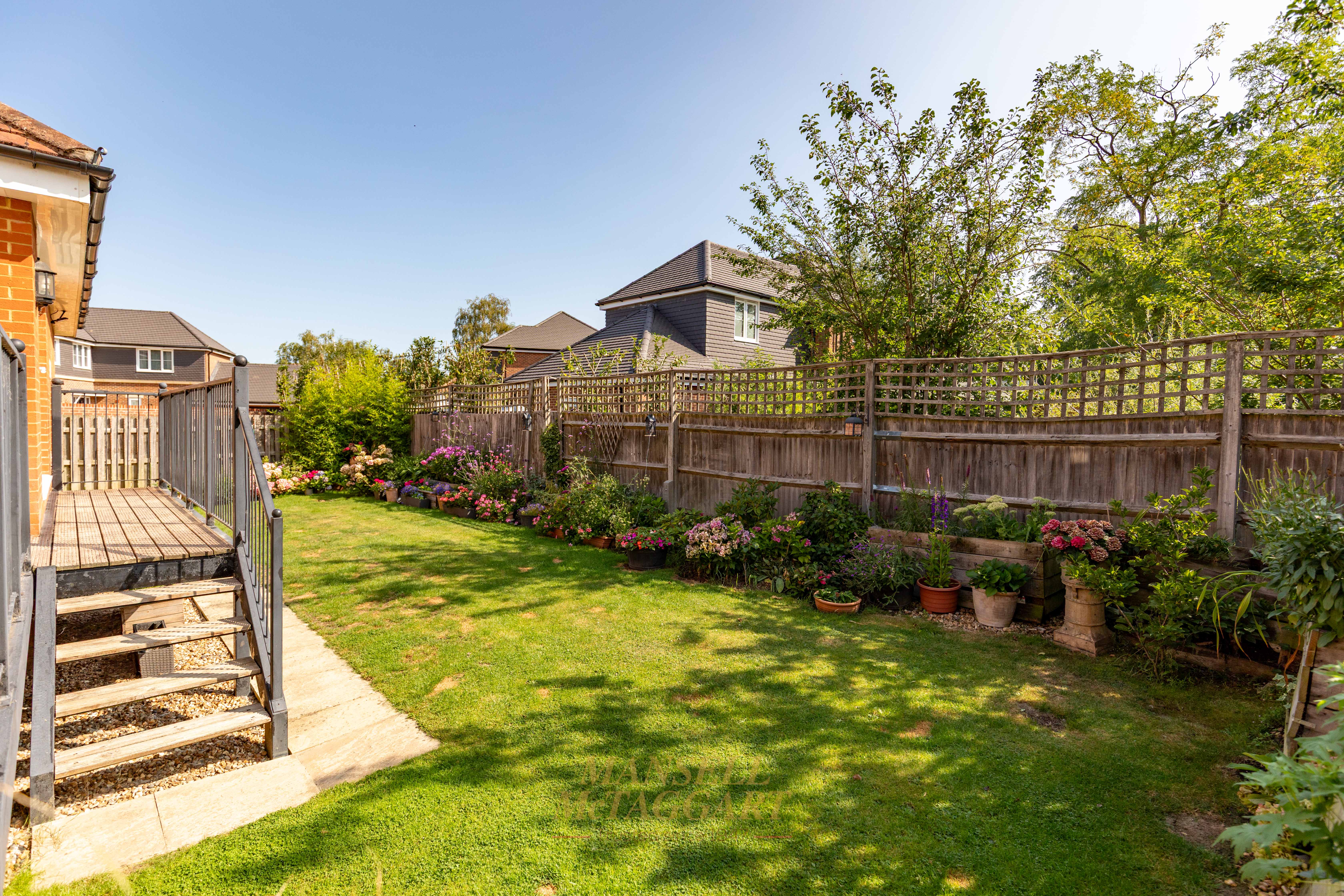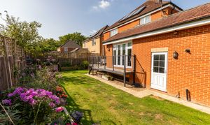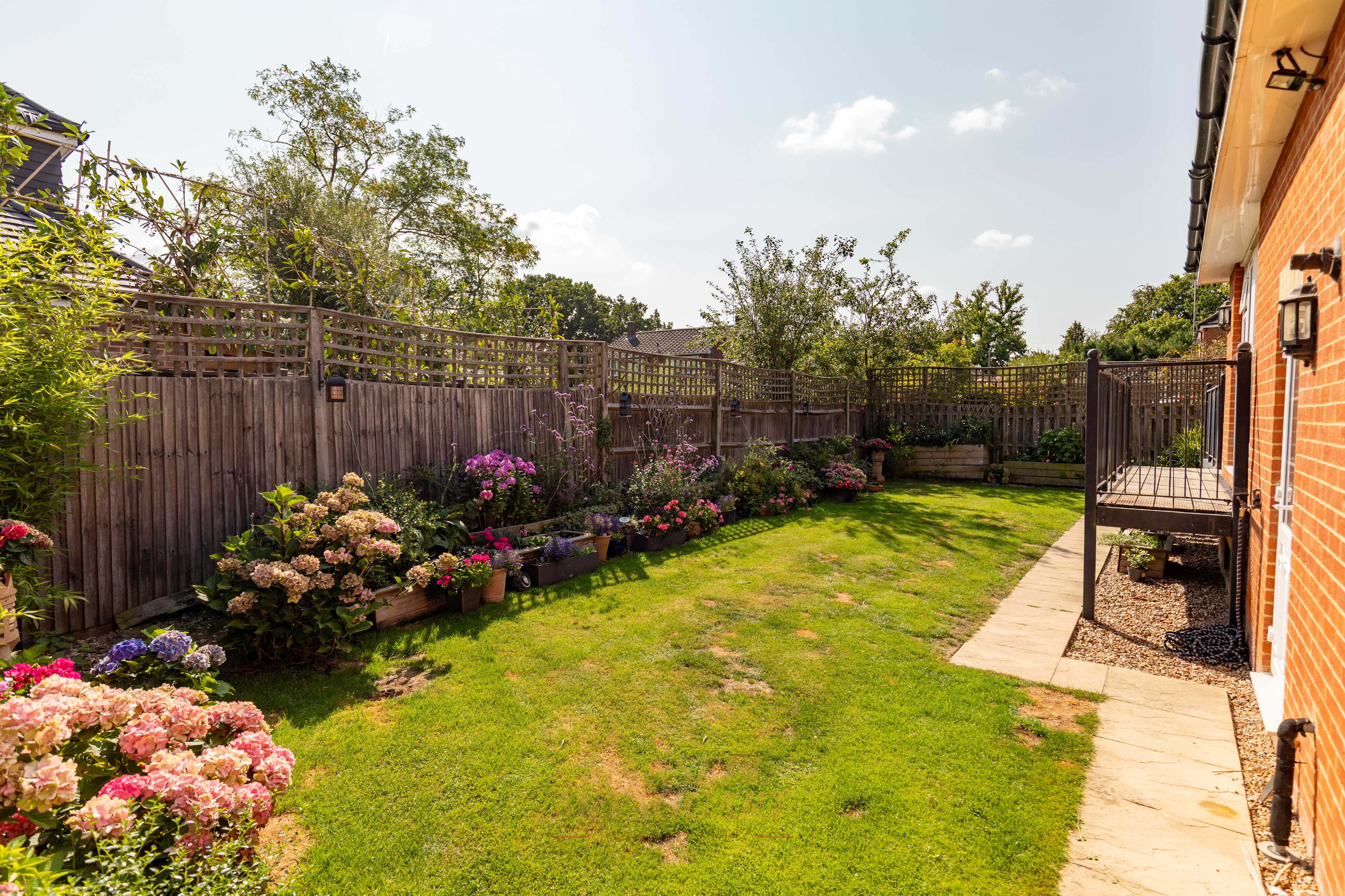 Outside, the garden benefits from a raised decking area abutting the property with stairs leading to the well-maintained lawed area with a plethora of mature trees and shrubs. The garden is enclosed within wood panel fencing with a side gate for access and a door to the double garage. To front, there is driveway parking for multiple vehicles and electric up and over door to the garage.
