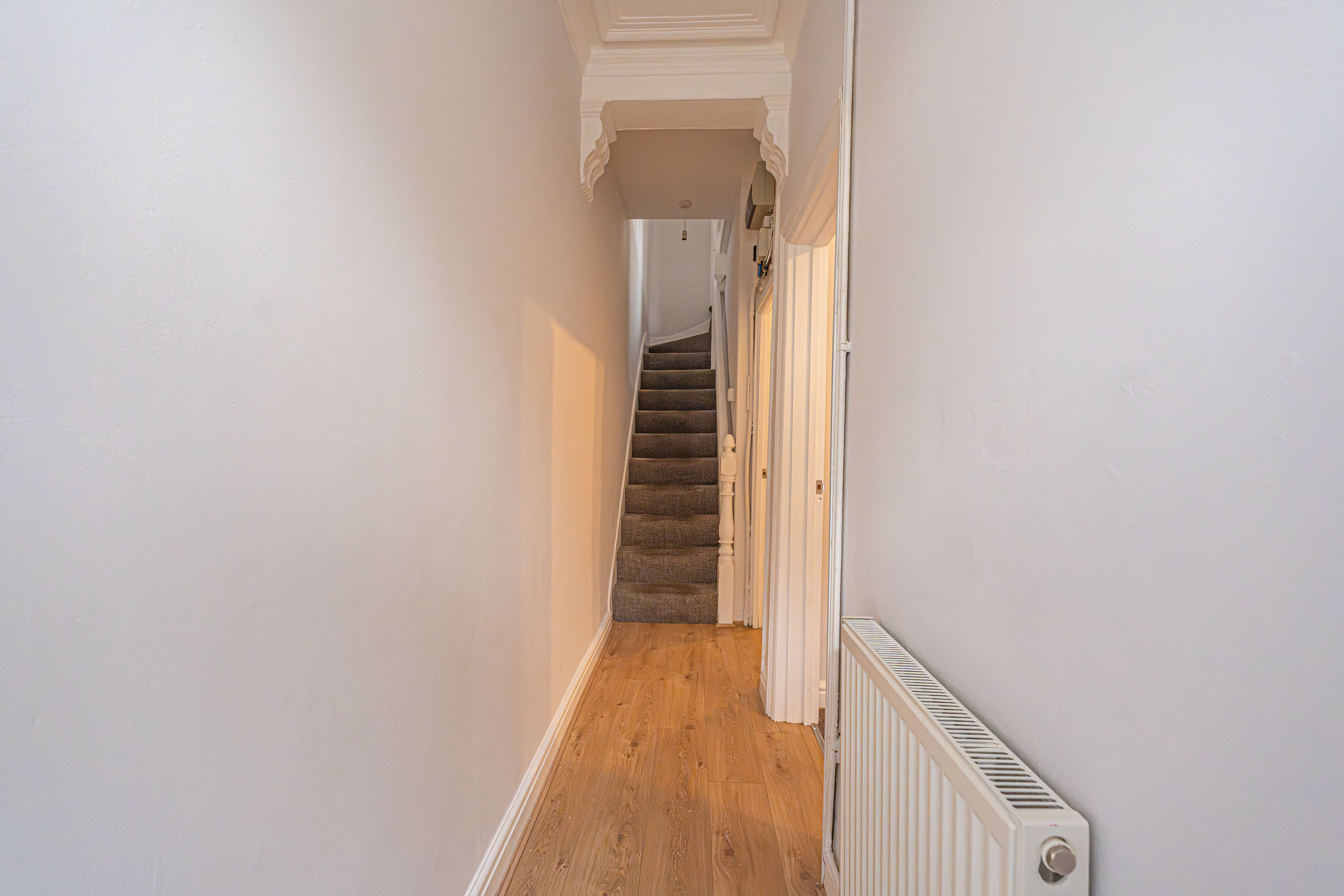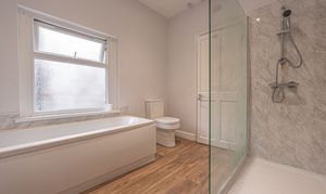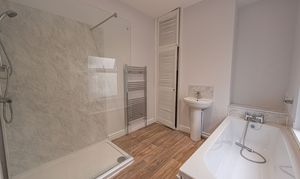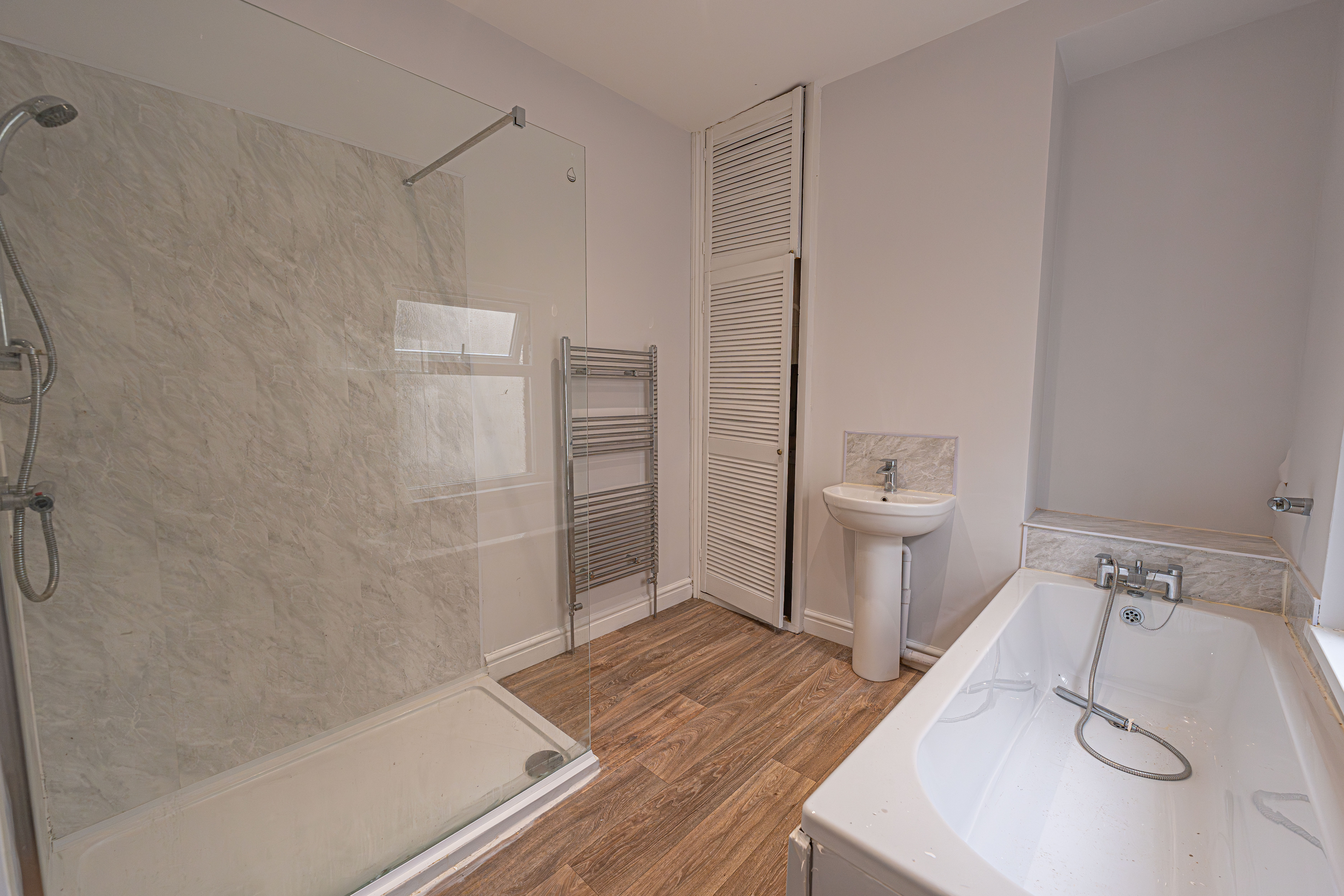 To the first floor we have the two bedrooms, both of which are double rooms, with the primary room at the front of the house benefitting from a superior size, multiple windows, and a helpful fitted wardrobe. The family bathroom is found to the rear of the house, with a generous size, and showcasing a luxurious walk-in shower, a separate bath-tub, and a useful airing cupboard.