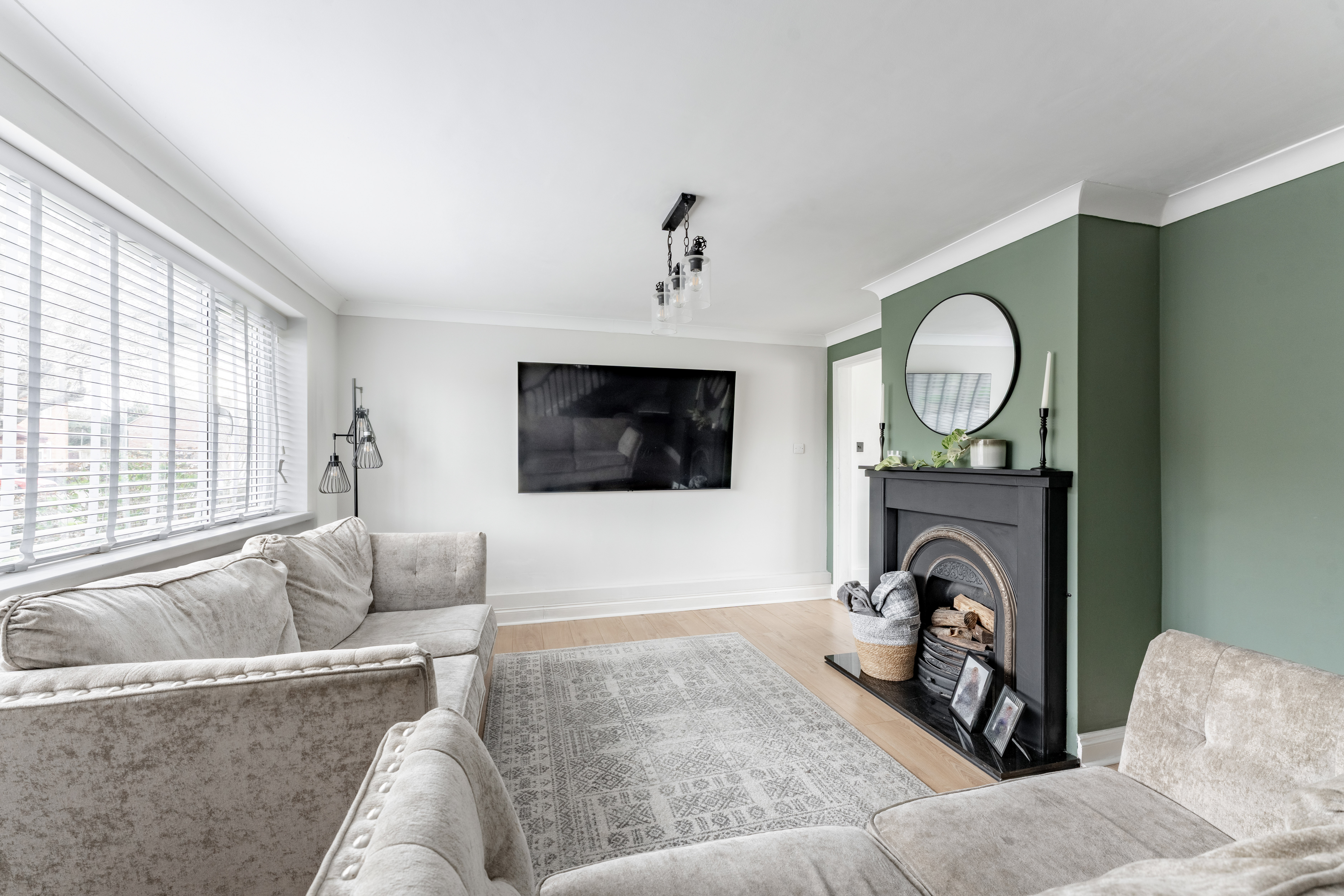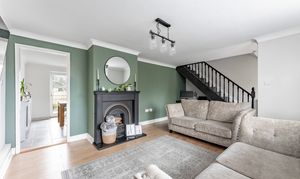 The living room is light and inviting, with a large front-facing window that fills the space with natural light, highlighting the laminate flooring and decorative fireplace. This space encourages both relaxation and entertaining, while the under-stairs area has been thoughtfully transformed into a home office, offering a functional workspace without compromising on style.