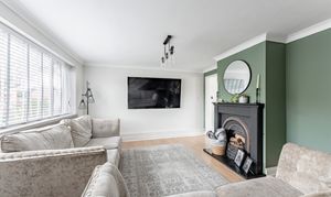 - Beautifully decorated living room with laminate flooring, a large front-facing window and a decorative fireplace, encouraging relaxation and entertaining