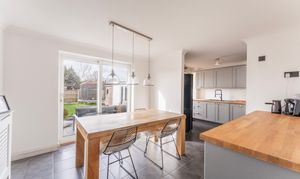 The kitchen and dining area forms the heart of the home, designed with everyday living and entertaining in mind. Sliding doors open directly onto the terrace, seamlessly extending the space outdoors. The dining area is enhanced by elegant pendant lighting, creating a calm, stylish environment for meals and gatherings. The kitchen is fitted with shaker-style grey cabinetry, quality worktops, a sink and drainer, integrated dishwasher, space for a range cooker, tall fridge/freezer, and a breakfast bar, offering both practicality and contemporary style.