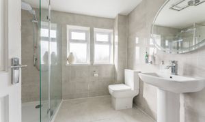 - Contemporary shower room comprising of a three-piece suite, complemented by quality fittings and an LED mirror