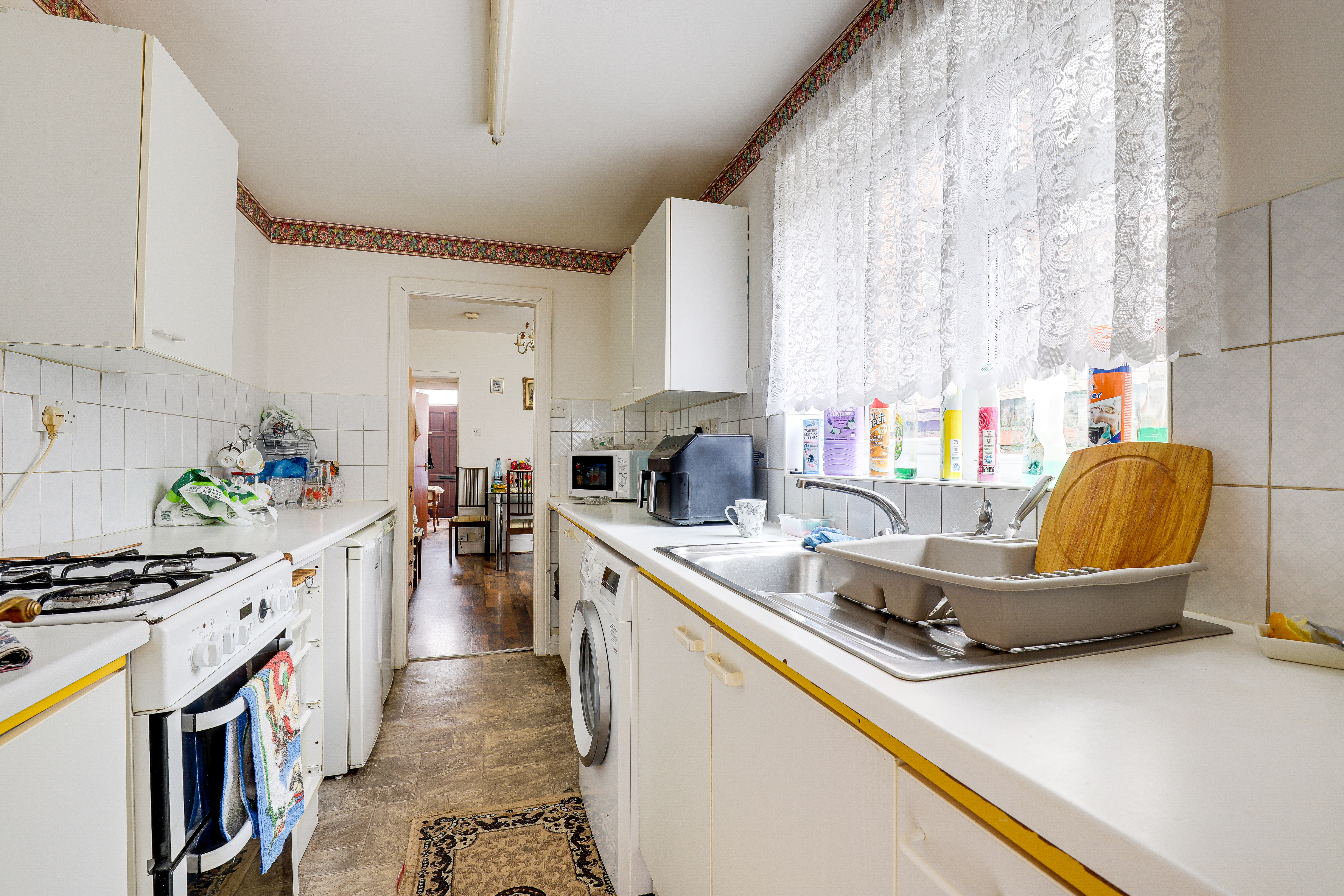 The dining room has a UPVC double glazed window to the rear elevation, a wall-mounted fire, wood-effect flooring, access to the cellar, and access into the kitchen.