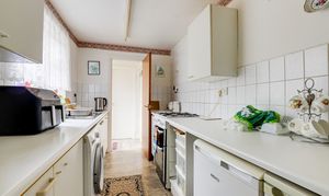 The kitchen has a range of fitted base and wall units with worktops, a stainless steel sink with a mixer tap and drainer, space for a freestanding cooker, space for an under-counter fridge and freezer, space and plumbing for a washing machine, tiled splashback, vinyl flooring, a UPVC double glazed window to the side elevation, access to the rear porch.