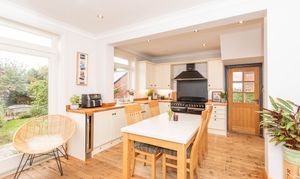- Stunning Open-Plan Modern Fitted Kitchen/Diner With Double Belfast Sink, Feature Fireplace & Patio Doors To The Garden