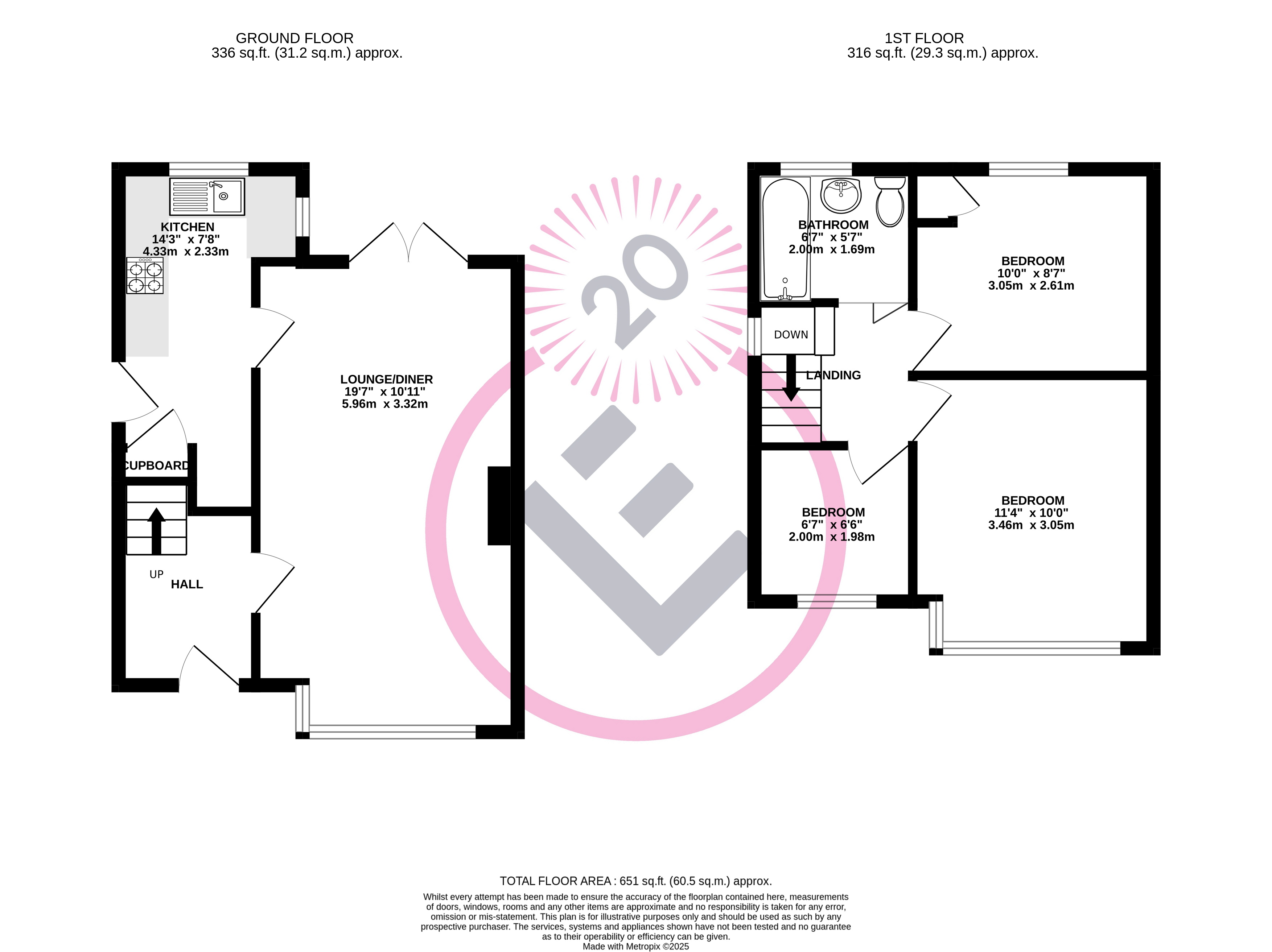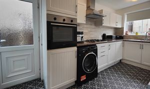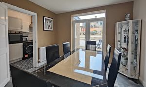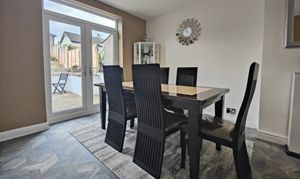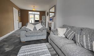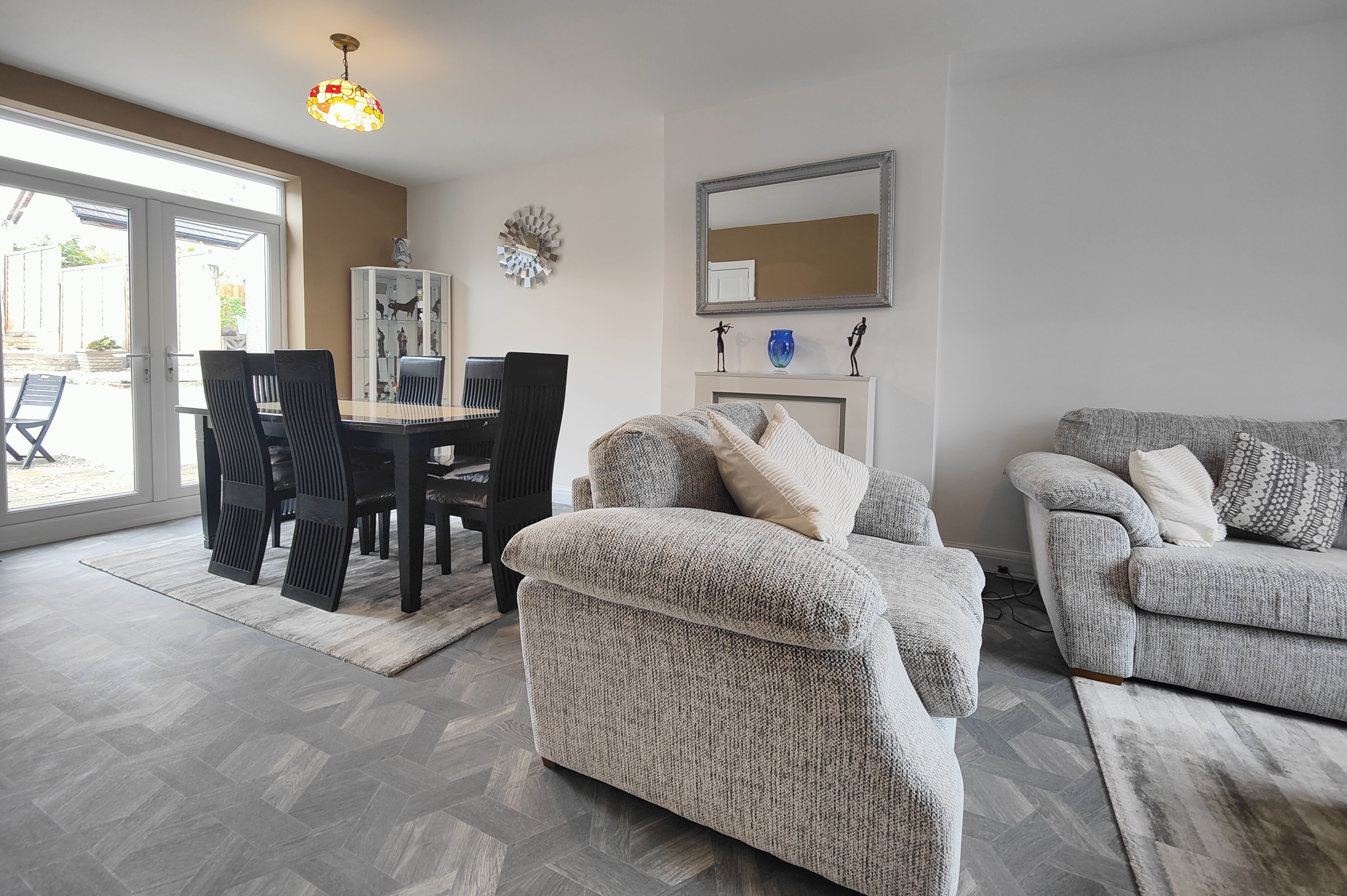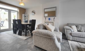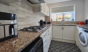 The front door opens to a welcoming hallway, stairs lead up to the first floor and a white panelled door opens to the living space. Being open plan with French Doors at the rear and a half bay window to the front the living space is light and airy. Fresh modern décor creates the perfect peaceful space in which to unwind and catch up. The kitchen to the side has white, shaker style cabinet doors complemented by a granite effect work top. Dual aspect windows again accentuate the light feel of the home. Integrated appliances include an eye level oven and gas bob with extractor hood above. Grey stone splashback tiling and feature flooring complete the look. There is an under stair storage cupboard.