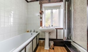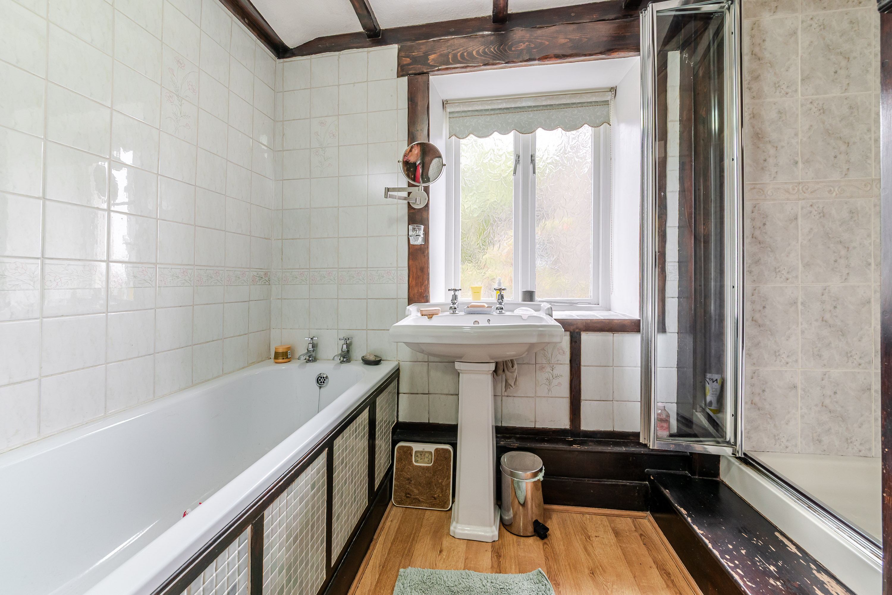 With timber and sealed unit double glazed window, ceiling light point, beamed ceiling with ceiling light point, part tiled walls and fitted with a suite comprising hand wash basin and low flush WC.
