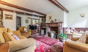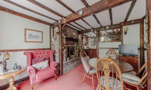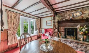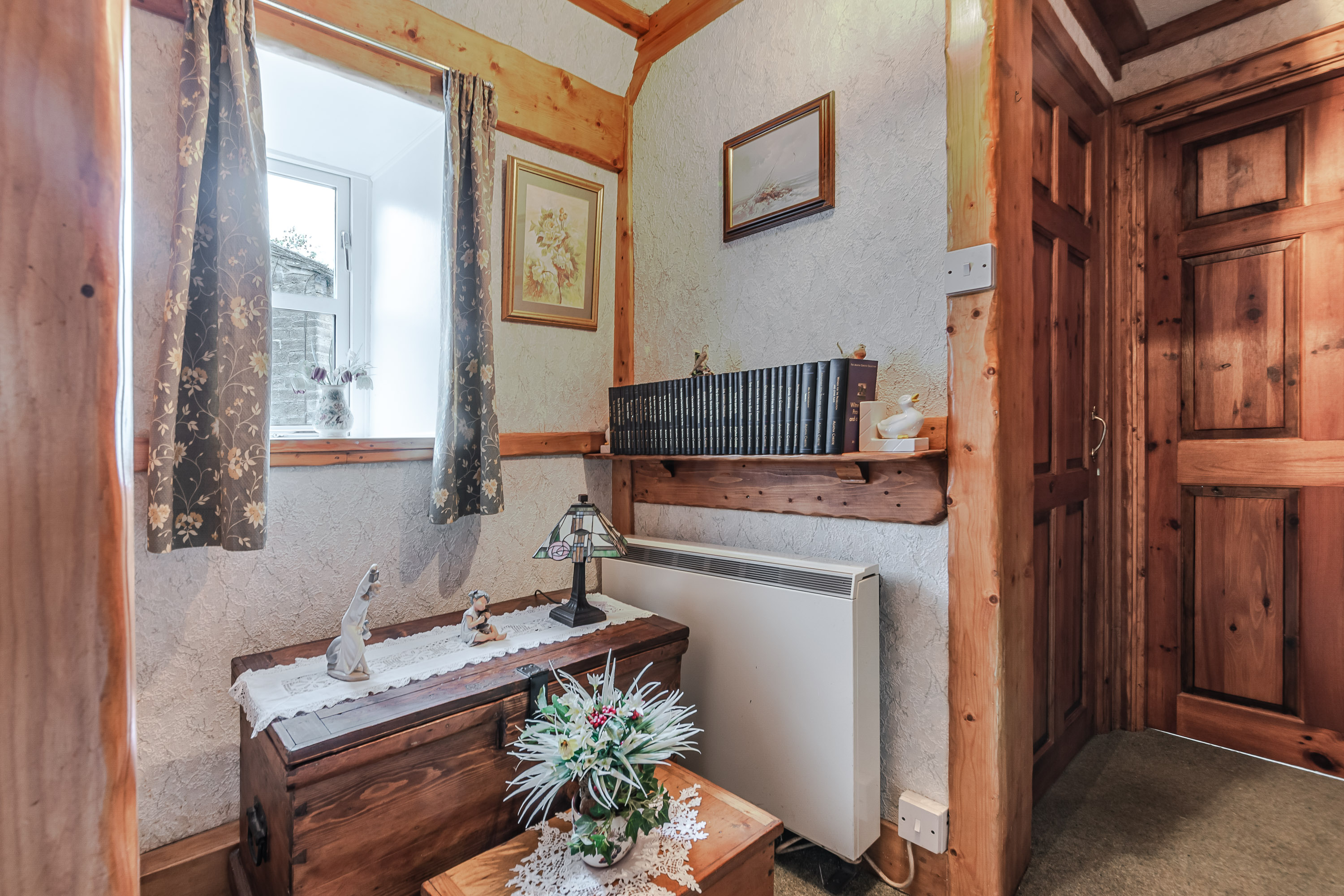 With timber and glazed mullioned windows looking out over the front garden together with window seat with radiator beneath, there is beamed ceiling, three wall light points and as the main focal point of the room there is an impressive chimney breast and fireplace with oak mantle and home to a dimplex electric flame effect fire which rests on a raised stone hearth. To one side a timber and glazed door gives access to the entrance lobby.
