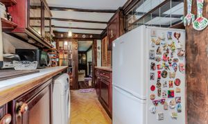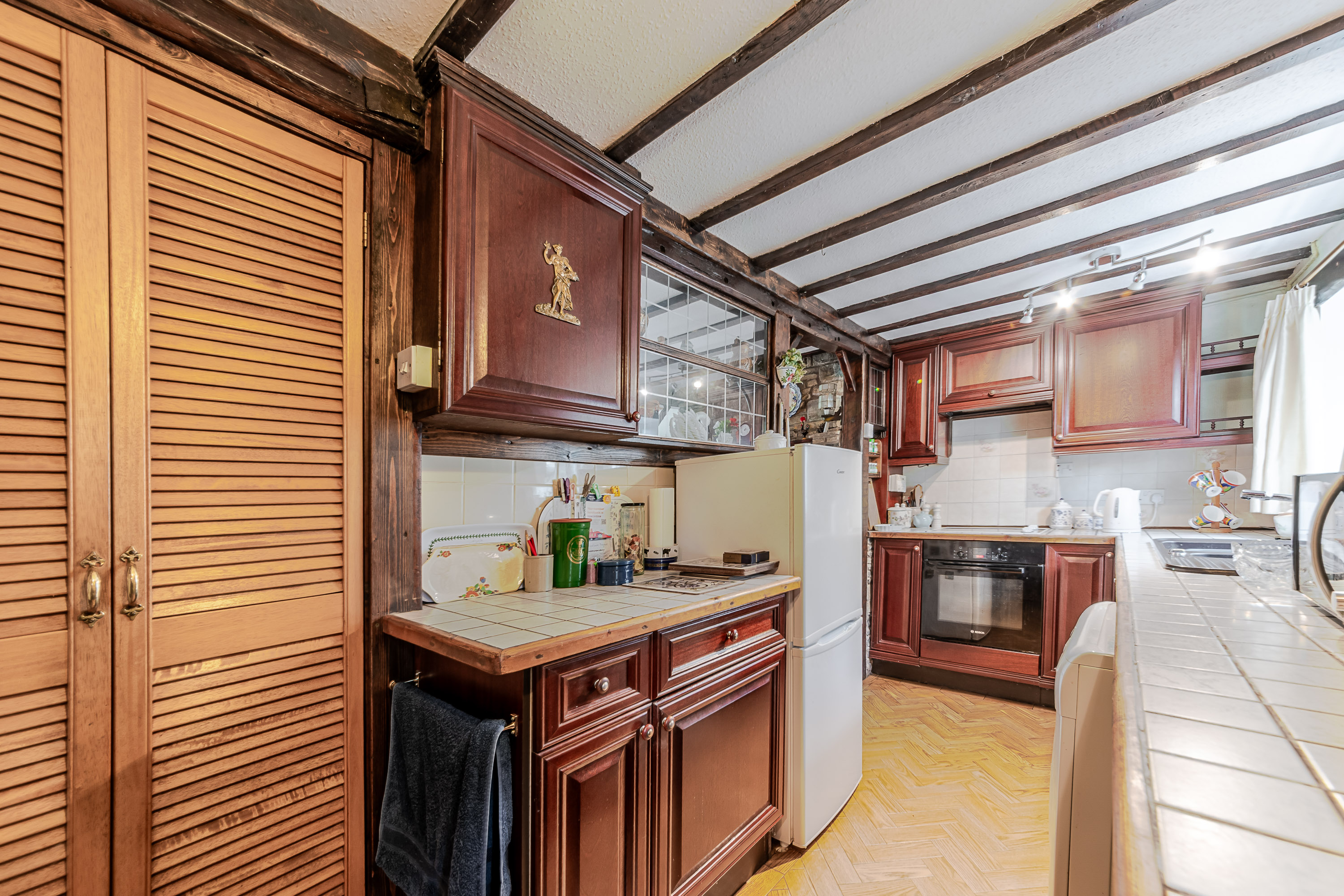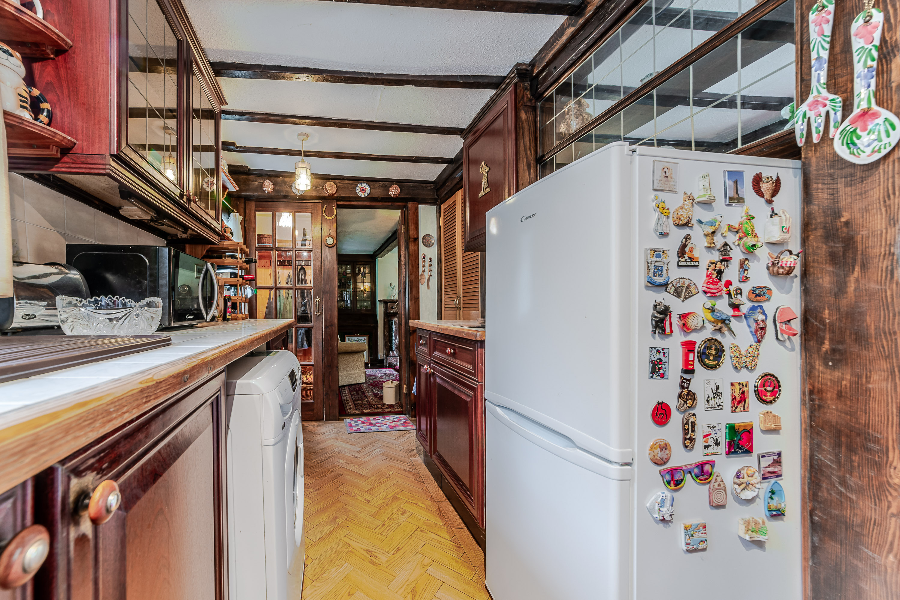 A generously proportioned reception room which has timber and glazed mullioned windows looking out over the front garden together with timber and sealed unit double glazed window to the rear elevation. There is a beamed ceiling, central heating radiator, polished and stained floor boards together with a small section of stone flagged flooring to the rear of the living room. There are three wall light points, fitted seat to the right hand side of the chimney breast with storage beneath whilst to the left hand side there is an oak leaded and glazed display cabinet with fitted shelving. The fireplace has a stunning marble surround with brick inset and tiled hearth. From the living there is a timber and glazed door leading into the entrance lobby and a timber and bevelled glass door giving access to the kitchen.
