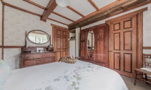 A double room with a bank of timber and sealed unit double glazed mullioned windows looking out over the front garden, there is a beamed ceiling, central heating radiator, fitted display shelving, useful storage cupboard and to one side a door gives access to a walk in wardrobe with fitted cloaks rail and shelving.