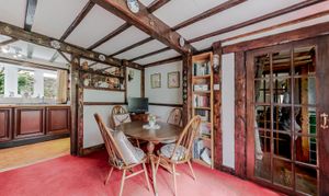 This has mullioned sealed unit double glazed windows and a further timber and sealed unit double glazed window all of which look out over the rear garden, there is a beamed ceiling with two ceiling light points, Herring bone oak effect parquet flooring and fitted with a range of base and wall cupboards, drawers, contrasting overlying tiled worktops, leaded and glazed display cupboard with shelving, wine rack, inset 1 1/2 bowl single drainer sink with chrome mixer tap, four ring halogen hob with extractor hood over and electric oven beneath, there is under counter space for washing machine, space for fridge freezer and to one side a timber and bevelled glass door gives access to a rear lobby which has ceiling light point, cloaks rail, quarry tiled floor and timber door giving access to the rear garden. From the kitchen a doorway gives leads through the dining room.