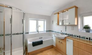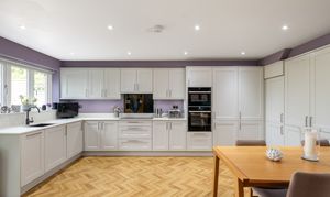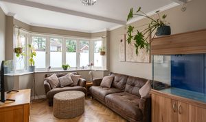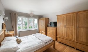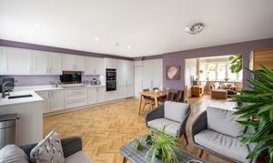 A highlight of the property is the stylish open-plan kitchen family room, a spacious area at the heart of the home, perfect for both relaxing and entertaining. The room seamlessly flows through sliding doors into the mature south-west facing rear garden, flooding the space with natural light, creating a warm and welcoming atmosphere.