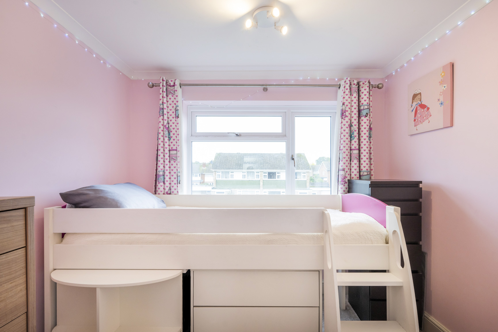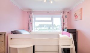 Bedroom Three is a charming single room, beautifully decorated in a soft powder pink that adds warmth and character. Perfect for a child’s bedroom or nursery, it also features a built-in over-stairs storage cupboard, offering practical additional space to keep the room neat and organised.