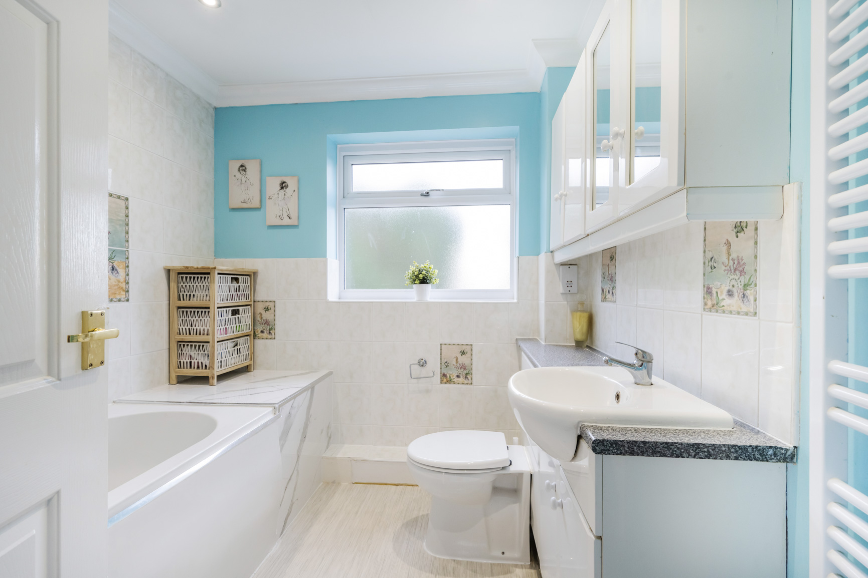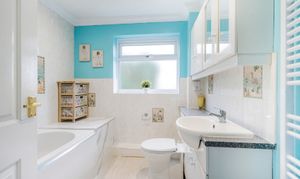 The family bathroom is beautifully presented in a fresh aqua blue and white colour scheme, creating a bright and calming seaside-inspired atmosphere. Attractive white tiling is complemented by charming seahorse feature tiles, adding a subtle coastal touch. The room offers excellent functionality, with ample cabinetry and a vanity sink unit providing generous storage and worktop space for everyday essentials and family accessories. Additional wall cabinets ensure everything has its place, keeping the room tidy and well-organised. A modern heated towel rail adds a touch of luxury and comfort, completing this stylish and practical family bathroom.
