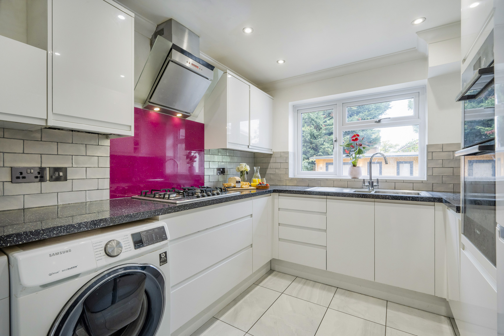 The modern kitchen is a true highlight of the home, combining sleek design with practical functionality. Bright and contemporary, it features stunning white tiles with a striking vibrant plum splashback that creates a stylish statement piece. The grey marble-effect flooring and contrasting black and speckled white worktops give the space a sophisticated finish.