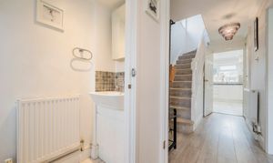 A convenient cloakroom is situated just off the hall, beautifully presented with designer tiling around the sink and a modern white suite—perfect for guests.