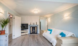 The light and spacious living room is a wonderfully welcoming space, decorated in soft pale blue tones that create a calm and relaxing atmosphere. A large picture window to the front allows plenty of natural light to flood the room, enhancing the bright and airy feel. The attractive wood-effect flooring adds a contemporary touch, perfectly complementing the room’s elegant décor.