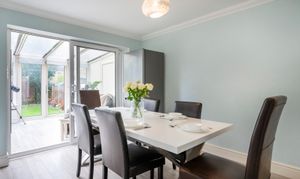 The dining room flows beautifully from the main living area, continuing the soft pale blue colour palette that runs throughout the home. A door connects directly to the kitchen for ease of serving, while sliding double doors open into the conservatory, creating a wonderful open-plan feel that’s perfect for entertaining. There’s plenty of space for a large dining table and additional furniture such as a sideboard or display cabinet, making it a practical yet elegant family dining space.