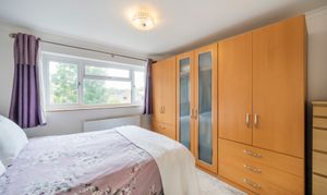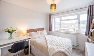 The principal bedroom offers a calm and relaxing retreat, decorated in soft neutral tones that enhance the sense of space and tranquillity. Generously proportioned, it can easily accommodate a triple wardrobe, providing excellent storage and organisation for clothes and accessories. There remains ample room for additional bedroom furniture, ensuring both comfort and practicality. An attractive archway alcove adds character to the room and offers flexible use — ideal as a dedicated wardrobe space, or a spot for a stylish chest of drawers. This elegant main bedroom provides a peaceful sanctuary at the end of a busy day, perfectly suited to modern family living.