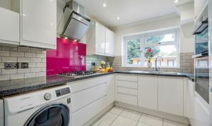 A large sink overlooks the pretty rear garden, making washing up a pleasure while enjoying the peaceful outdoor view. Altogether, this kitchen offers a sleek, modern aesthetic paired with exceptional practicality—ideal for busy family life.