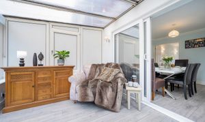 The conservatory is a bright and inviting extension of the home, featuring stylish light grey wood-effect flooring and ample room for comfortable seating — an ideal spot to enjoy morning coffee or unwind with views of the garden. The space can easily serve as an additional living room or play area, with half-height walls and generous glazing allowing natural light to pour in throughout the day. From here, doors open to the patio area and a side access door provides convenient entry to the garden, making this a versatile and much-loved part of the home.
