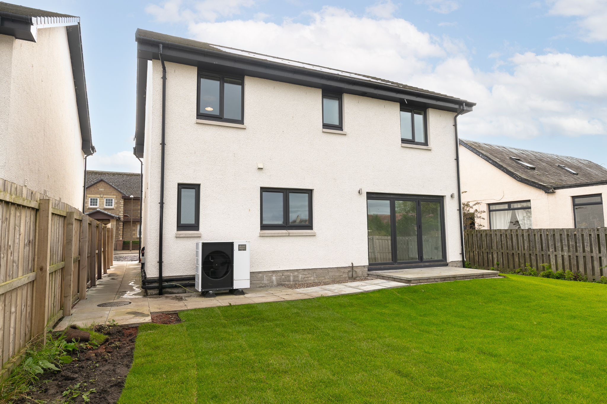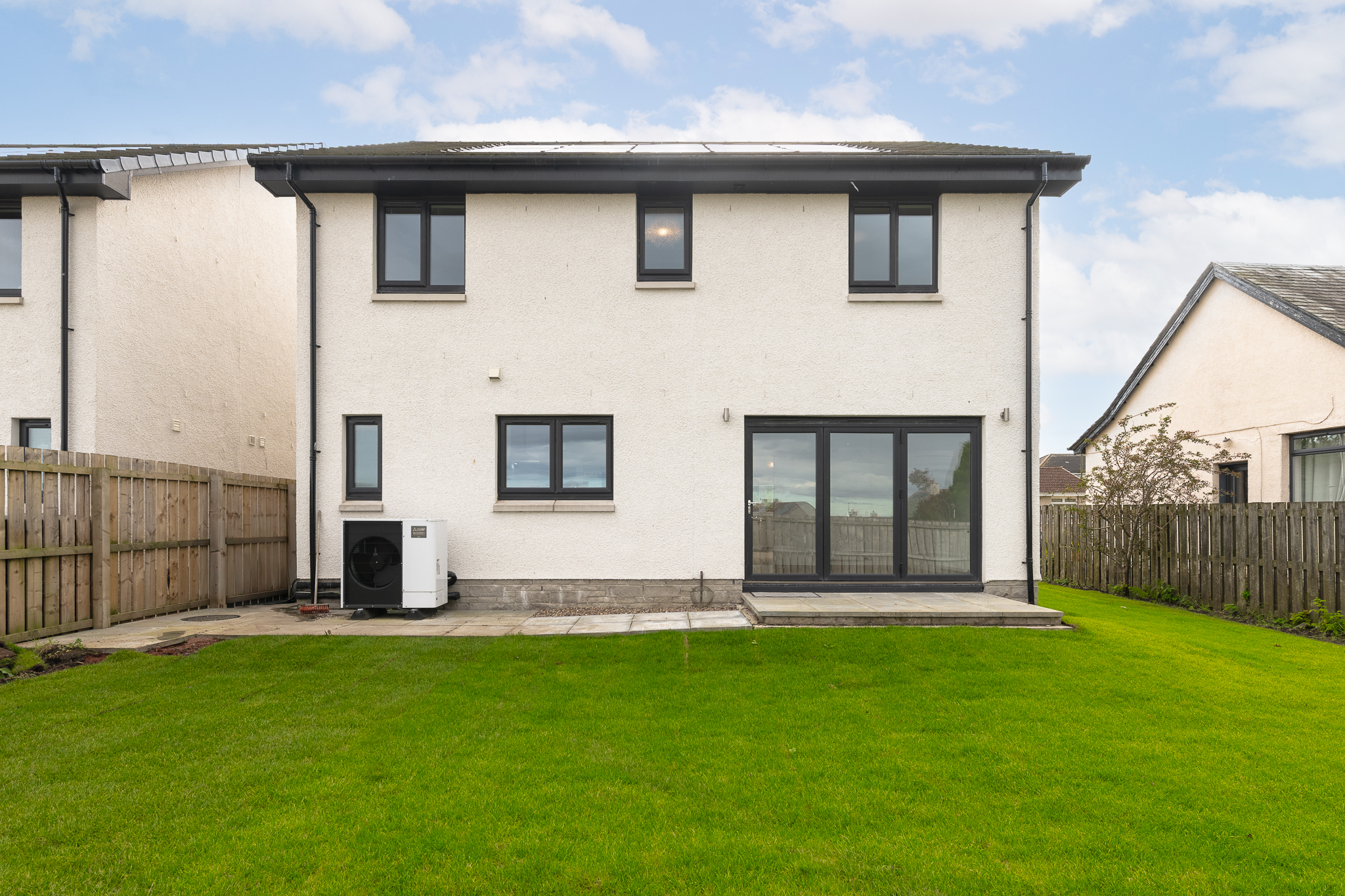 This home has been finished with high-quality details such as porcelain tiles, spotlights to both the kitchen and bathrooms, energy-efficient heating with an air source heat pump and a turfed front and rear garden.