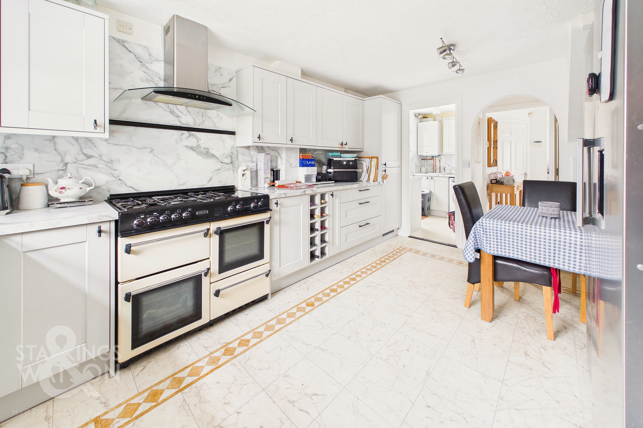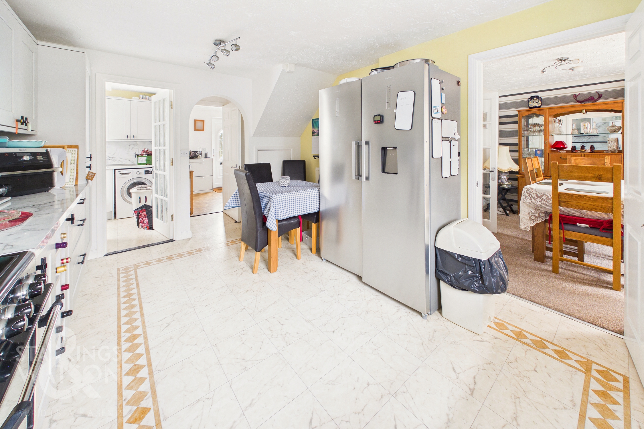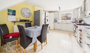 Once inside, a central hallway is the first place to greet you granting access into all accommodation on the ground floor as well as stairs to the first floor. Immediately to the right a predominantly tiled ground floor WC is presented with wood effect flooring laid underfoot. The kitchen sits to the right hand side of the stairs having undergone a recent refurbishment in 2023. The space offers a multitude of wall and base mounted storage units with square edge work surfaces leaving space for a gas range style oven and hob with modern extraction fan above. Within the kitchen the floor space opens up to leave room for a formal dining table with handy under the stairs storage cupboard or to be an access from this space. The current owners make use of the space to accommodate an American style fridge/freezer with an integrated dishwasher found within the cabinetry as well. Just behind the kitchen sits a modernised utility room finished at the same time as the kitchen with matching suites - the space also is home to the modernised gas central heating combination boiler.