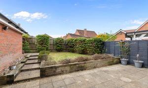 The 39’ x 33’ (maximum measurement) west facing garden is laid to lawn with border, substantial paved patio and side access.