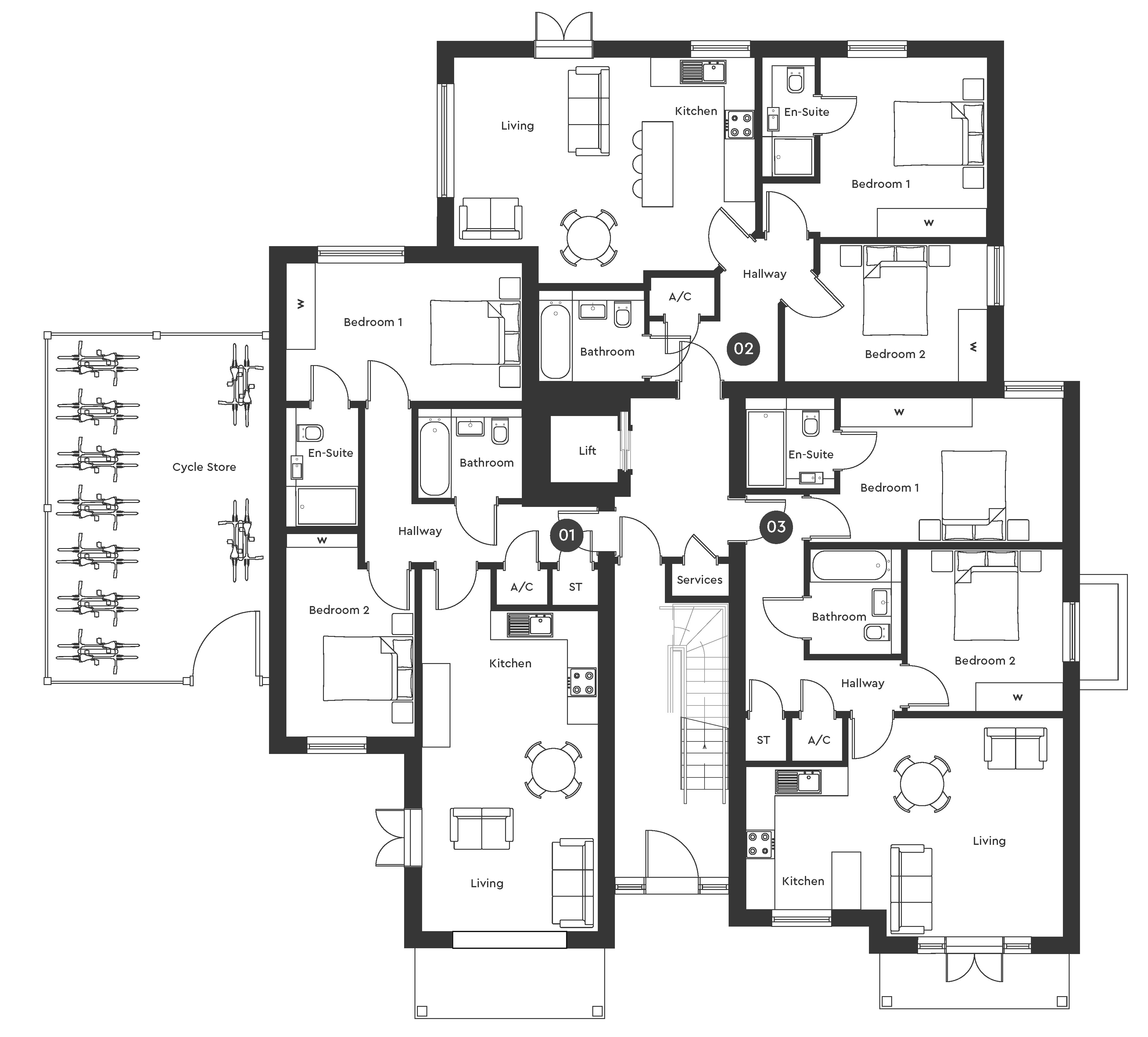 Each apartment comes with either a balcony or patio (ground floor only) where you can relax, dine alfresco, or enjoy the verdant outlook with a book. You can park your vehicle in one of the 9 designated spaces (five of which have EV electric charging points). This dwelling is meticulously designed to cater to every aspect of contemporary living. The extensive communal grounds are to be landscaped to provide ease of maintenance with beautiful mature oak trees and shrub borders and leading to the secure bike store.