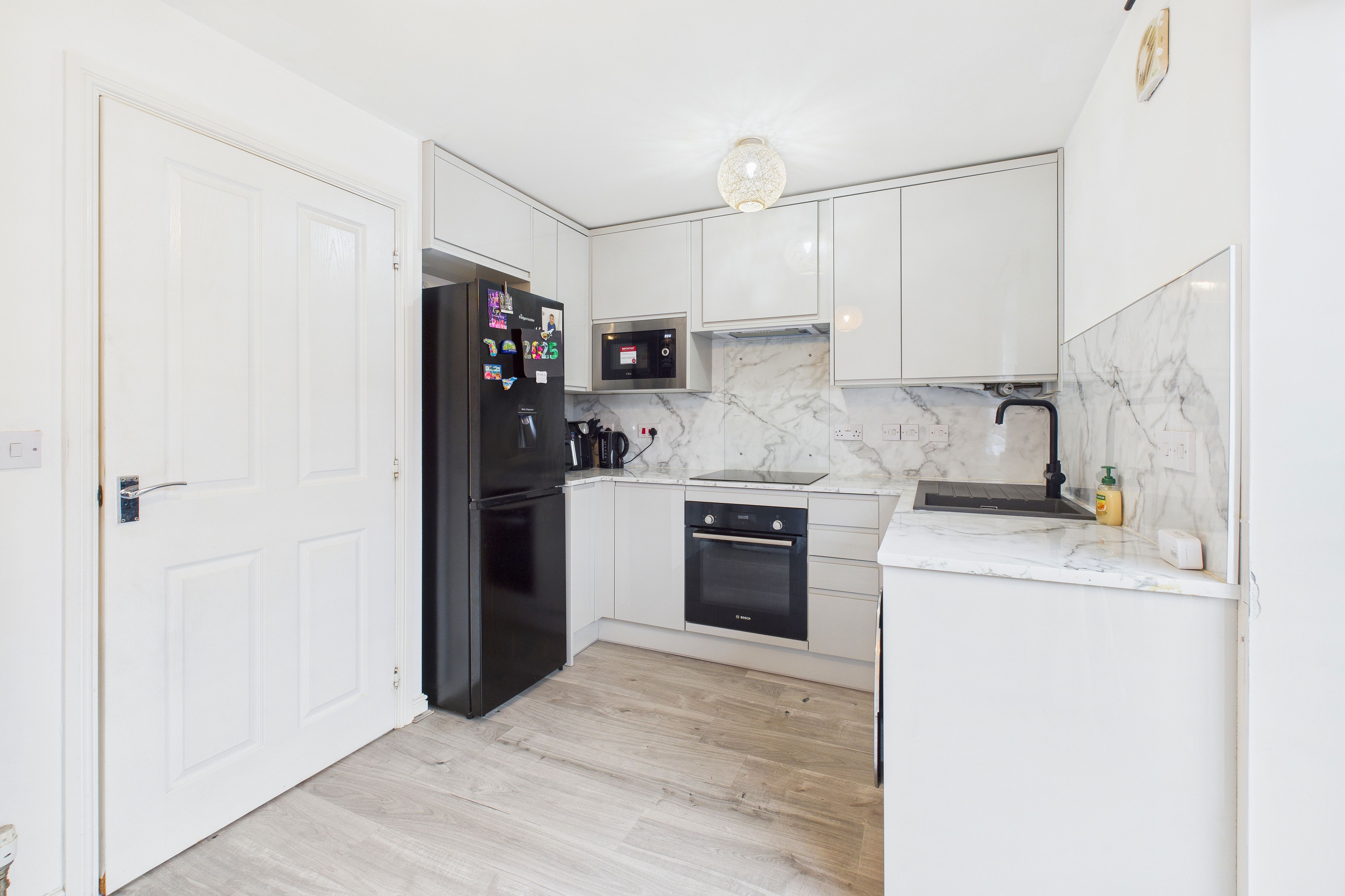 The heart of the home, the stylish modern kitchen, stands as a testament to both form and function. Adorned with high gloss units and embraced by the allure of patio doors that invite the outside in.