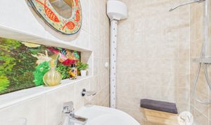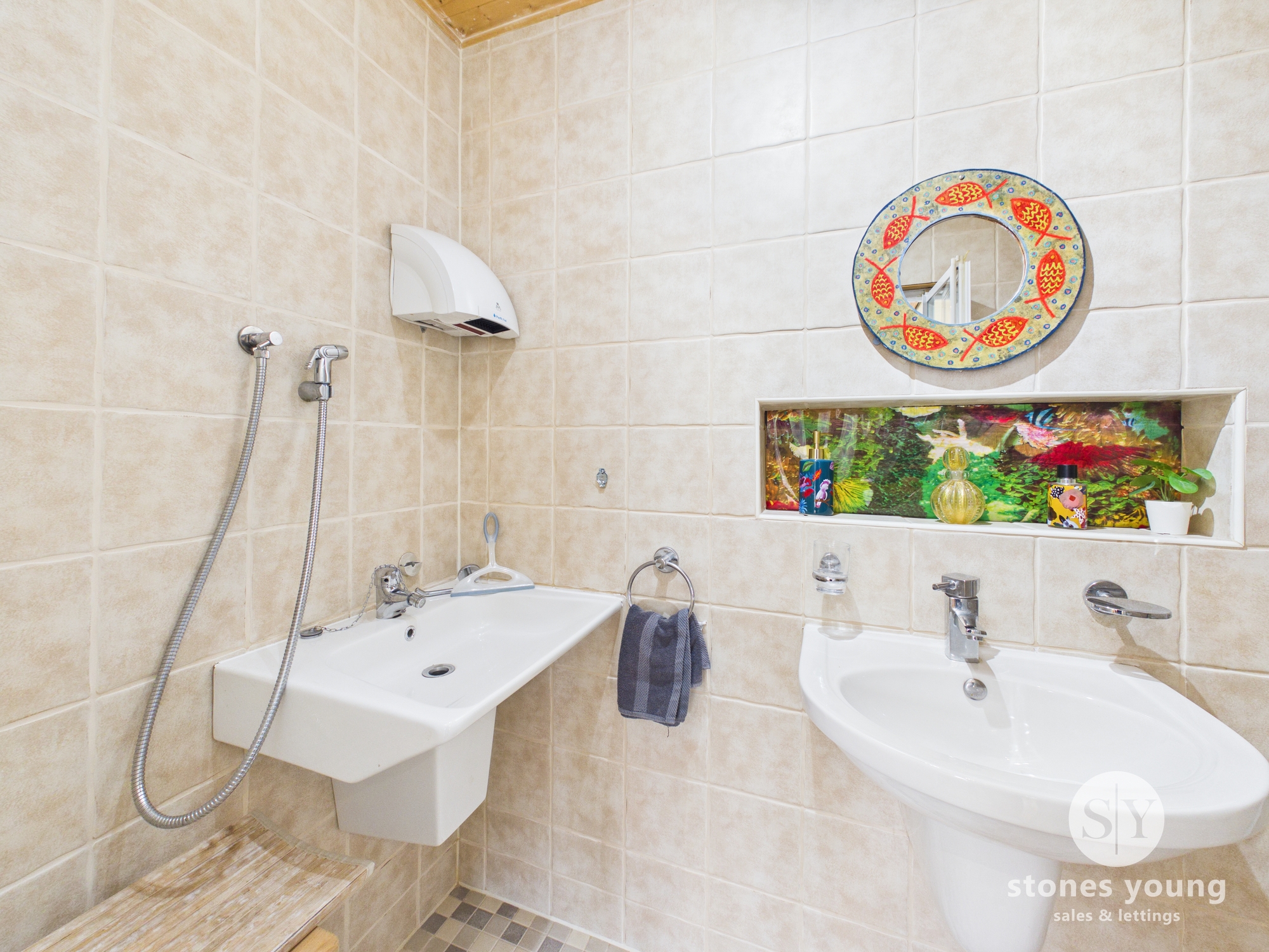 Tiled flooring, tiled floor to ceiling, rainfall shower wet room, 2 sinks one of which can be plumbed to waste pipe, extractor fan, ceiling spotlights.